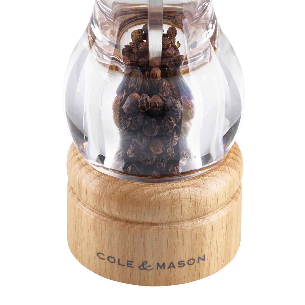 A classic set of salt and pepper mills made from acrylic and beech from a sustainable source. The beech has been finished with a clear lacquer to allow the natural beauty of the wood grain to shine through. The 105 Beech Wood Gift Set offers transparent acrylic so you can view the contents knowing, which is which, plus, knowing when it is time to fill up. The Cole & Mason Precision Mechanism does not crush peppercorns but strips them to release maximum flavour with each turn. The salt mill features the diamond sharp ceramic mechanism cutting through the hardest of salt and peppers, allowing for a smooth and even turn. You can easily adjust the grind from fine to course with ease. For peace of mind the 105 Beech Wood Mill mechanisms come with a lifetime guarantee and beautifully packaged ready for gifting.