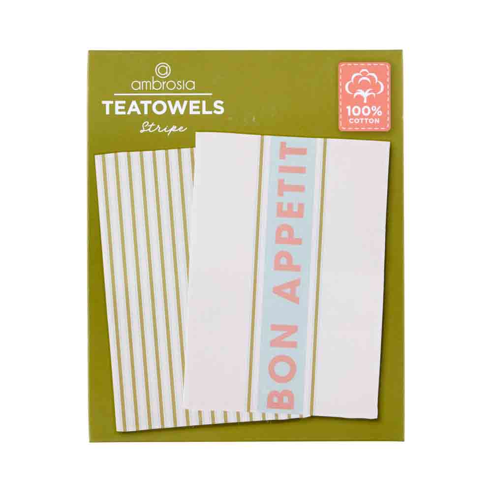Add a stylish touch to your kitchen towels with the Ambrosia® Set of 2 Tea Towels. Designed with functionality in mind, these tea towels will make all your tasks in the kitchen a breeze. Crafted from 100% cotton, these tea towels are highly durable and easy to clean, ensuring its effortless to maintain a hygienic, smoothly running kitchen. The cotton construction ensures maximum absorbency and softness so you can continue to use time and time again. Beautifully packed with gifting in mind, the Ambrosia® Set of 2 Tea Towels are a must have. Coordinate with the matching Ambrosia® Apron or Ambrosia® Oven Glove for added cohesiveness and style.