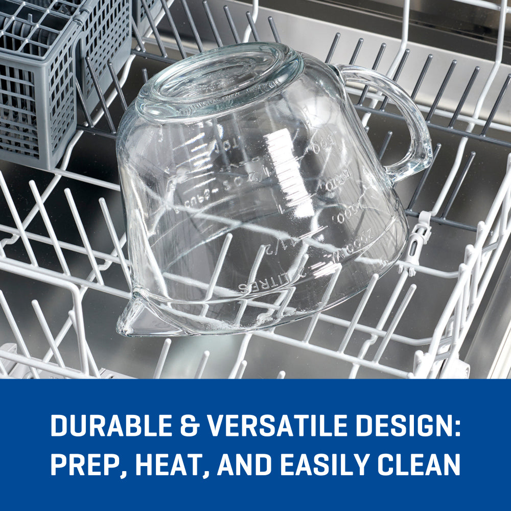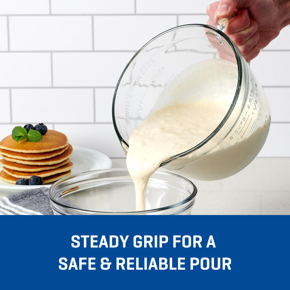 The Anchor Hocking 1.9L Batter Bowl is the ultimate mixing multitasker. Mix, measure, pour, cover, and store – all in one vessel. Glass is extra-thick with an easy-grip handle for exact pouring and added stability. At 1.9L, it’s the perfectly sized mixing bowl to whip pancake or waffle batter, whisk eggs for omelettes, proof dough, marinate meats, veggies, or tofu and much more. Glass batter bowl is oven-safe (up to 218°C), microwave-friendly, and dishwasher safe.