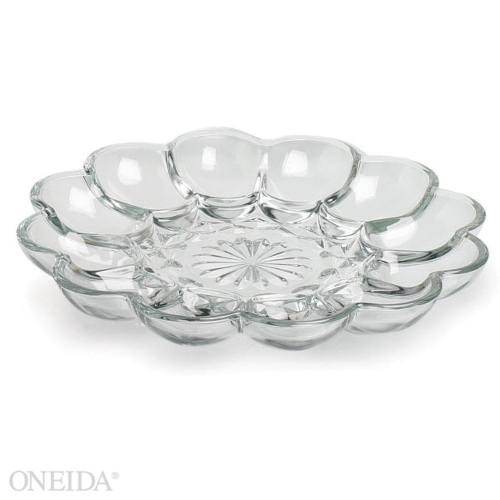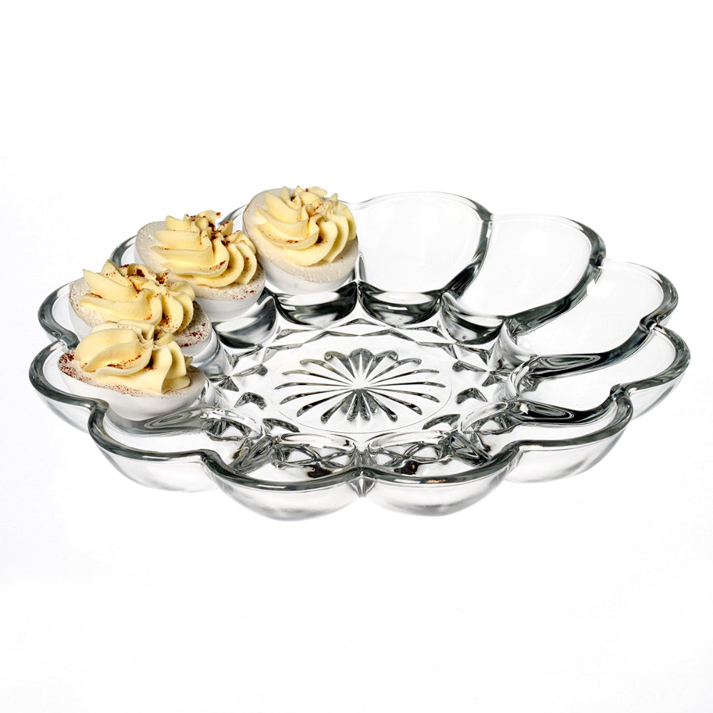 Vintage, retro, or exactly what's next—this glass platter is devoted to a holiday entertaining must-have, the simply delectable, devilled egg. The classic cut-glass design is perfectly portioned to cradle 12 devilishly delicious servings, preventing any awkward egg slip-and-slides as you carry it to the table. This versatile platter will inspire you to turn traditional devilled eggs into a sophisticated appetiser worthy of any holiday or party table. The glass won't react to ingredients, retain odours, or stain, and cleans up beautifully in the dishwasher.