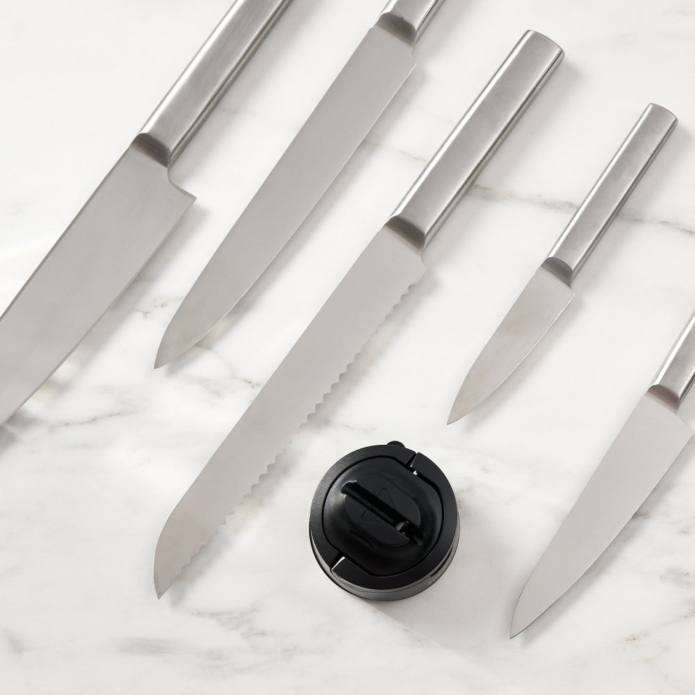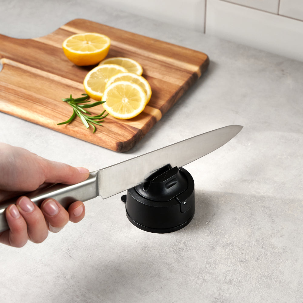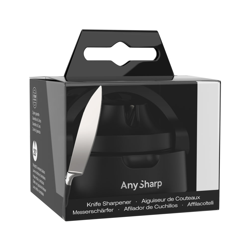 Anyone's an expert with AnySharp! This Evo Knife Sharpener is the best tool you’ll own. It brings dulled and blunt knife blades back to life by restoring their super-sharp edge. With sharpening surfaces moved closer to the edge, you can sharpen the entire blade right up to the handle — almost like having a brand-new knife. It features a safe design with new enhanced suction for a secure grip while sitting neatly out of the way as you sharpen. With a compact size and lightweight design, it can be stored neatly in a drawer, cupboard or toolbox when not in use. A great tool to have, it works on virtually any steel knife, from hardened steel to serrated blades like bread or hunting knives. Anyone can use this professional knife sharpener at home, with no training required! Enrich your kitchen with this Evo Knife Sharpener from AnySharp.