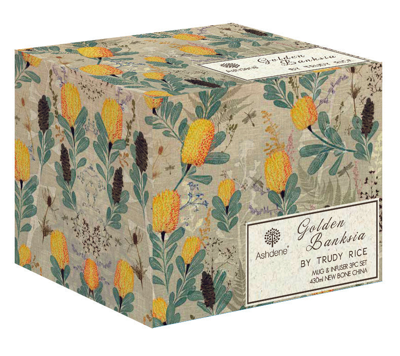 The Ashdene Golden Banksia collection features a stunning banksia flower in an ambient, joyful setting. The Golden Banksia 3 Piece Infuser was designed by artist Trudy Rice and blends the printmaking processes of solar plate etching and monotype to create her original artworks. Brew hot or iced tea with this 3 piece tea infuser set.