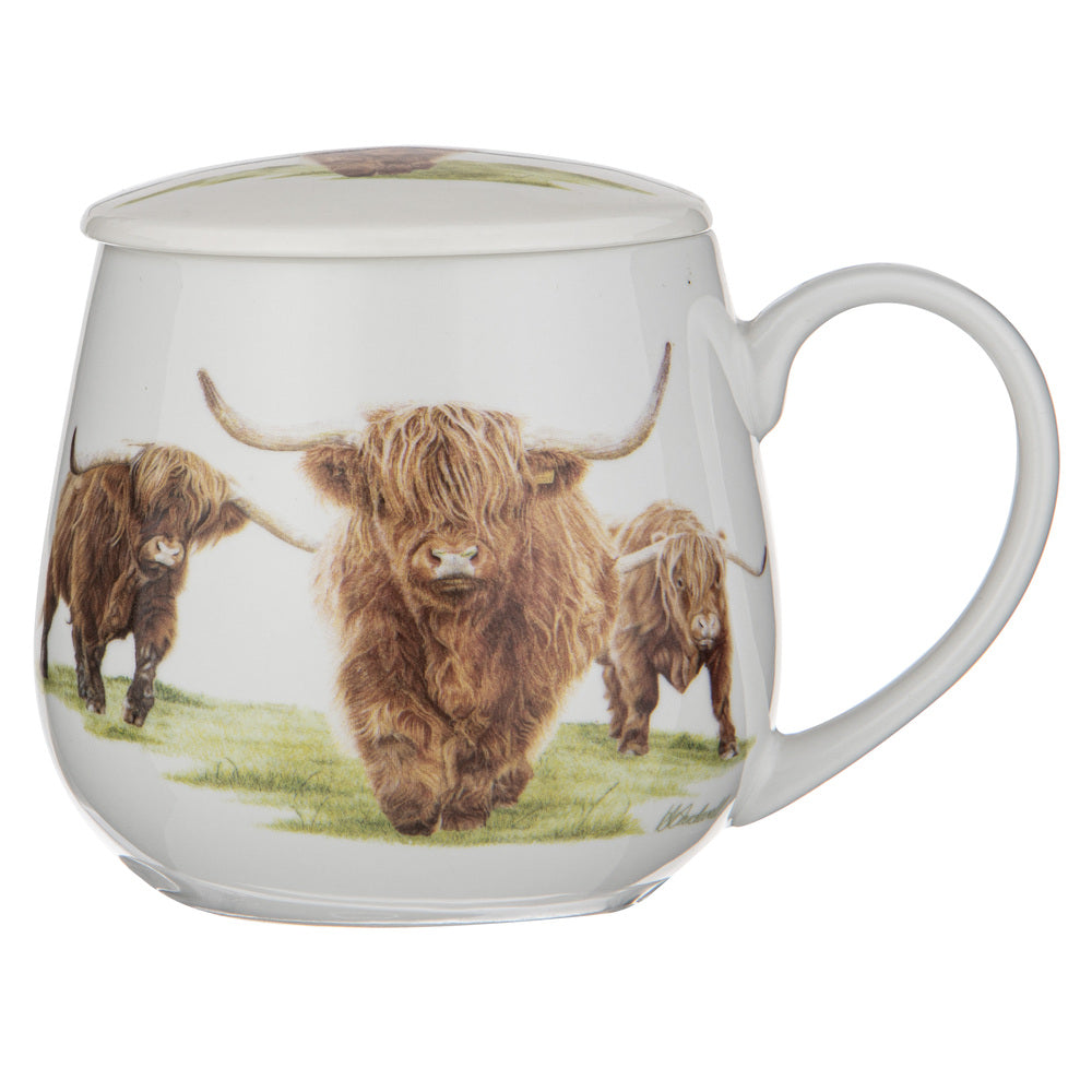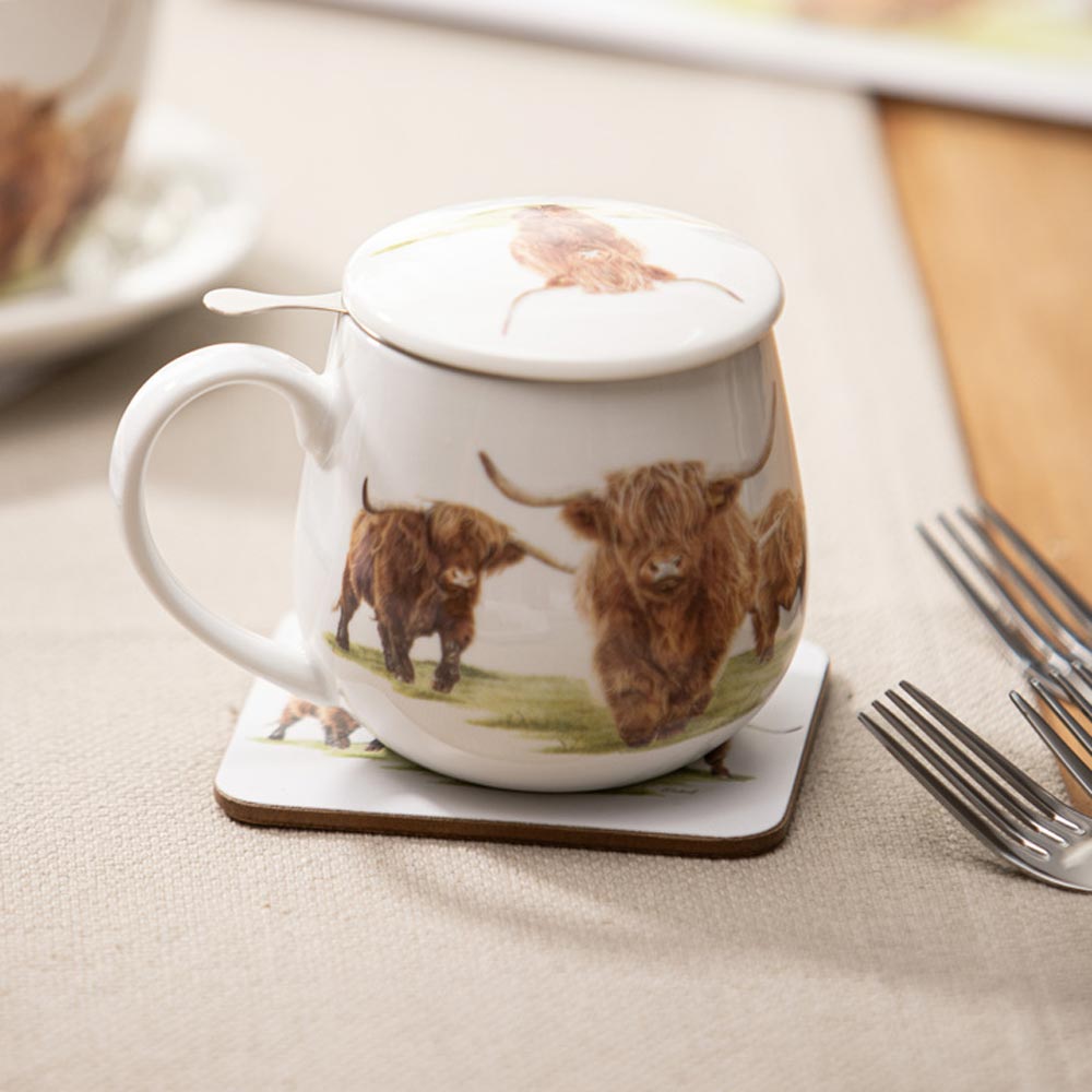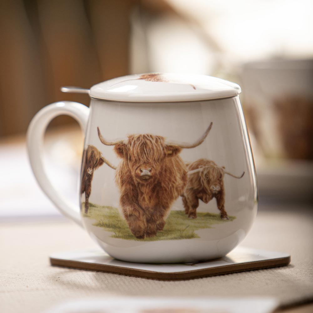 Enjoy quiet farm life with the Ashdene Highland Herd 3 Piece Infuser. The Highland Herd Collection features the artwork by Harriet Blaskett, who skillfully renders these charming three Highland Cows. Harriet delves into the very essence of these magnificent creatures residing at the serene Green Lane Farm in the UK, beckoning those seeking a tranquil countryside escape. Crafted from New Bone China for durability, each sip of freshly brewed tea will transport you to your favourite country escape. Equipped with an infuser and cup to drink from, you will never be without your favourite tea. Designed to mix and match with other Highland Herd pieces, the Ashdene Highland Herd 3 Piece Infuser also beautifully packaged with gifting in mind.
