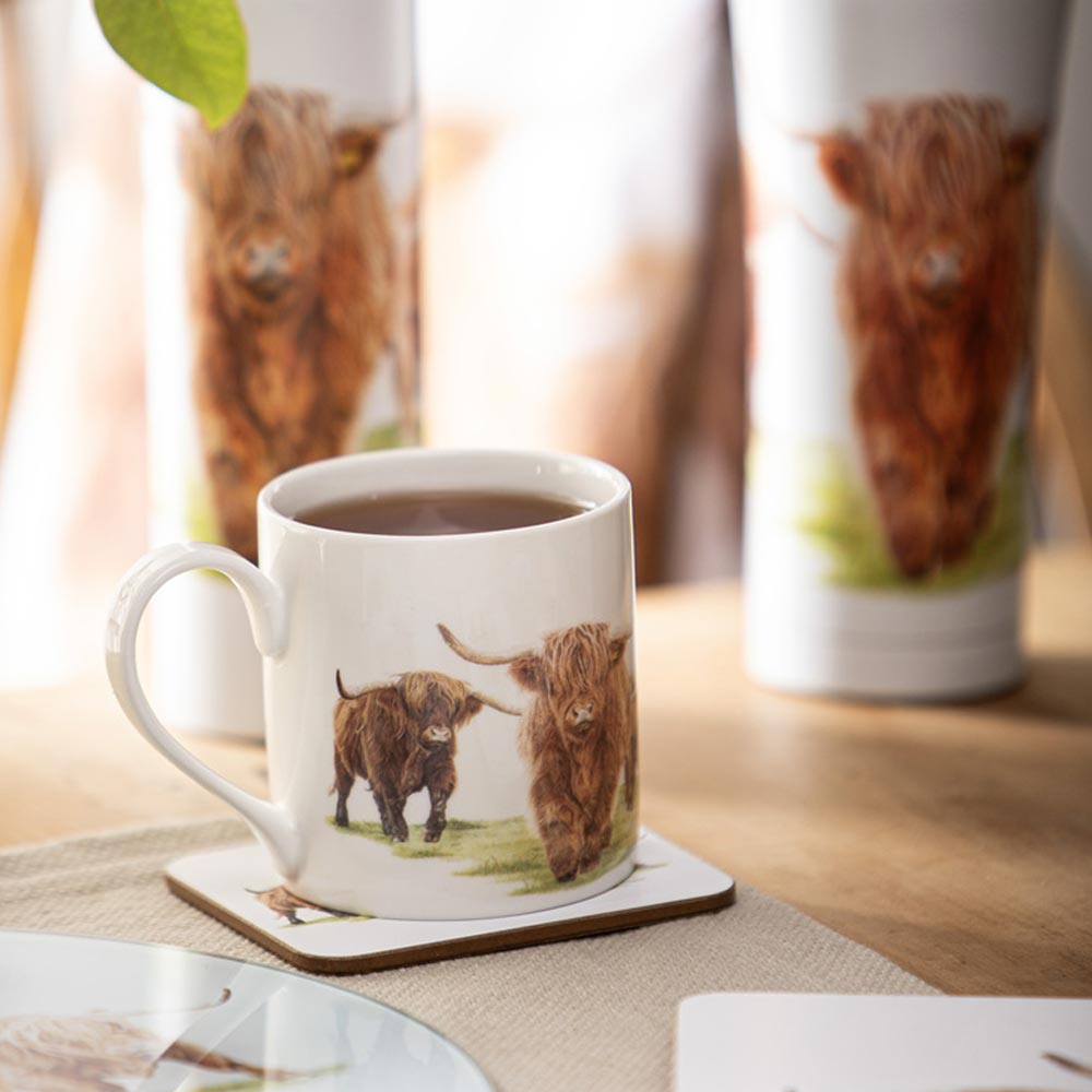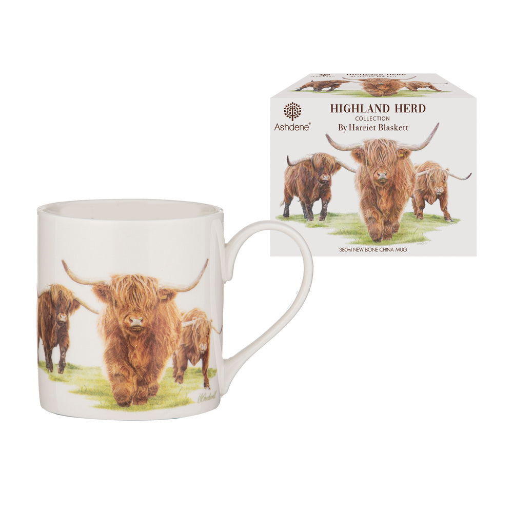 Enjoy quiet farm life with the Ashdene Highland Herd Mug. The Highland Herd Collection features the artwork by Harriet Blaskett, who skillfully renders these charming three Highland Cows. Harriet delves into the very essence of these magnificent creatures residing at the serene Green Lane Farm in the UK, beckoning those seeking a tranquil countryside escape. Crafted from New Bone China for durability, each sip of tea or coffee will transport you to your favourite country escape. Designed to mix and match with other Highland Herd pieces, the Ashdene Highland Herd Mug is also beautifully packaged with gifting in mind.