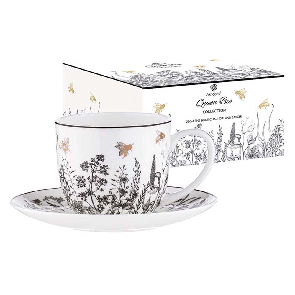 Delight guests with freshly steeped tea and home-baked biscuits served from the Ashdene Queen Bee Cup & Saucer 350ml. Overflowing with rustic elegance, the Ashdene Queen Bee Cup & Saucer 350ml displays an intricate fine-point illustration of wildflowers in a rich black tone that pop out from a fresh white backdrop. Refined style paired with premium durability is brought to the tabletop thanks to its quality new bone china construction. Graced with metallic gold honeybees at enchanting intervals, it’s hard to beat the unique design and luxury aesthetic of this cup & saucer. For a beautifully curated tea party, pair the Ashdene Queen Bee Cup & Saucer 350ml with more equally impressive pieces from the Queen Bee line.