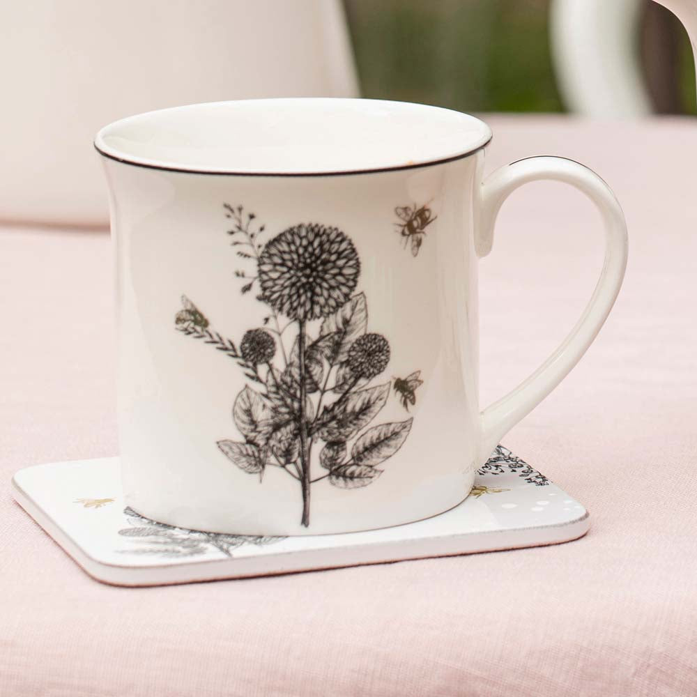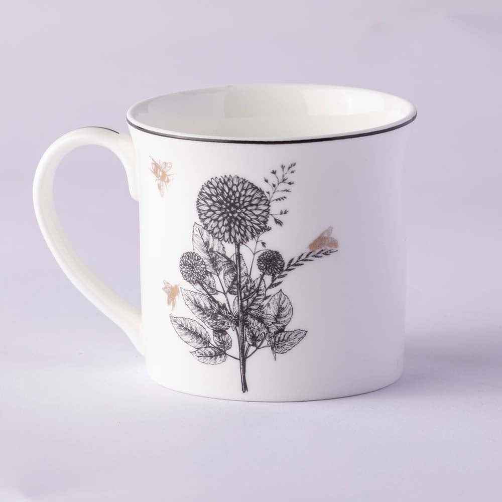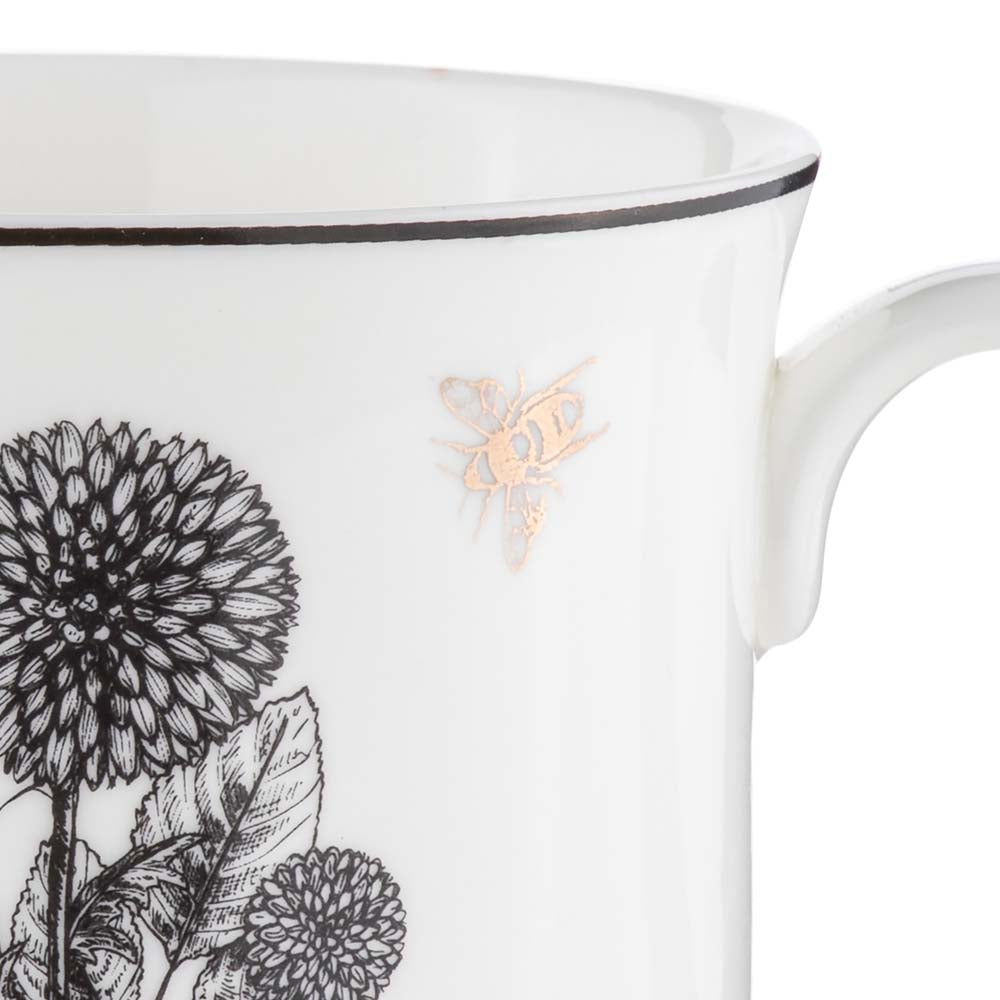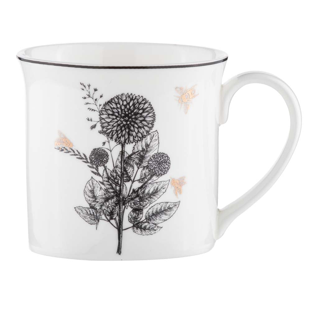 Infuse your morning coffee with the rustic elegance of the Ashdene Queen Bee Wide Flare Mug 260ml. The rich black motif, showcasing an intricate, fine-point illustration of wildflowers, stands out in contrast atop the pure white backdrop. The classic new bone china construction of the Ashdene Queen Bee Wide Flare Mug 260ml offers refined style alongside optimum durability. Fill its 260ml capacity with freshly brewed coffee or aromatic tea and curl your fingers around its ergonomic handle. Metallic golden honey bees are dispersed across the beautiful scene, adding a welcome touch of glimmering opulence. Complete the Ashdene Queen Bee Wide Flare Mug 260ml with other teatime pieces from the exquisitely designed Queen Bee collection.