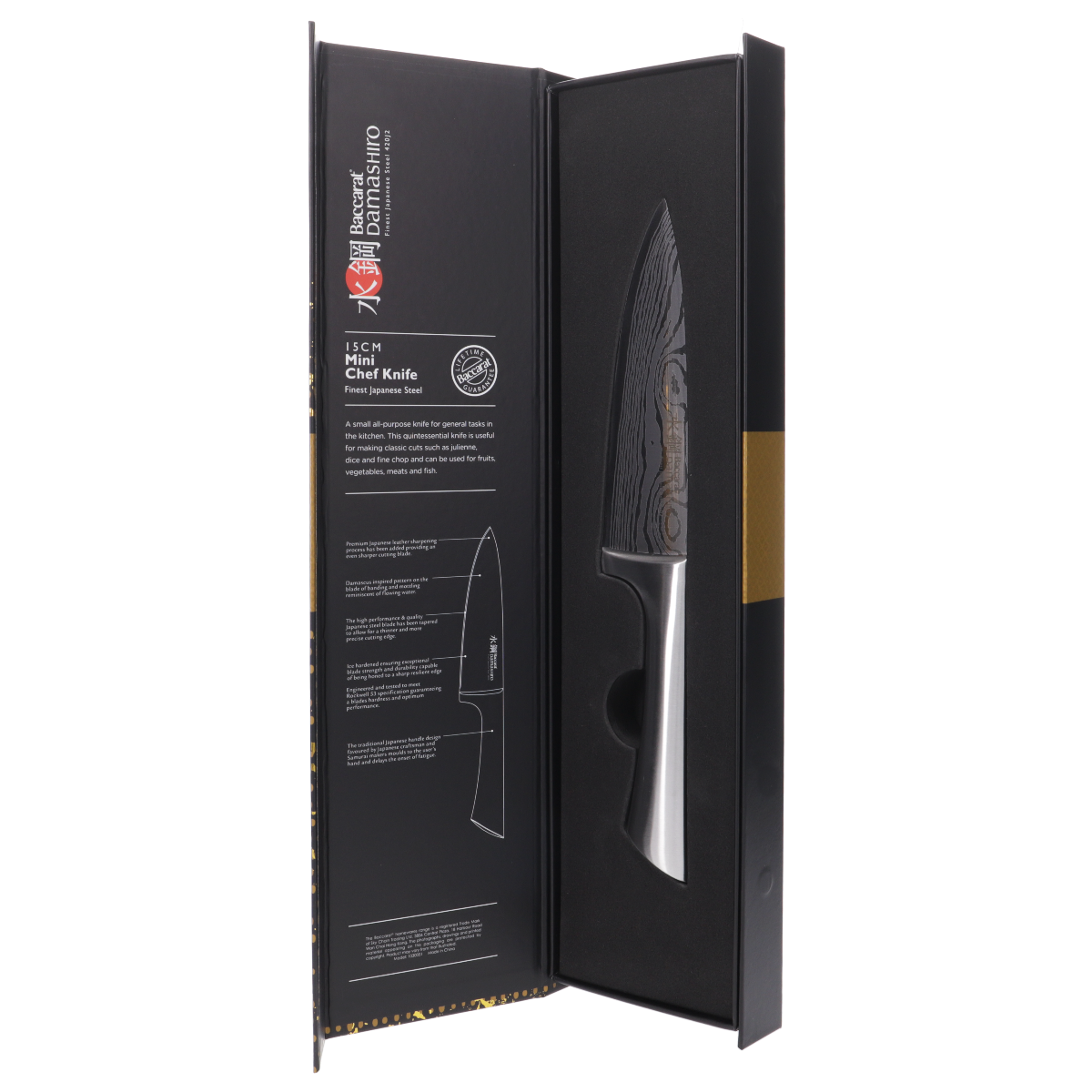 The Baccarat® Damashiro™ Mini Chefs Knife (15cm) is traditionally known as a cooks knife. It is an all-purpose knife that is curved to allow the Cook to rock the knife on the cutting board for a more precise cut.