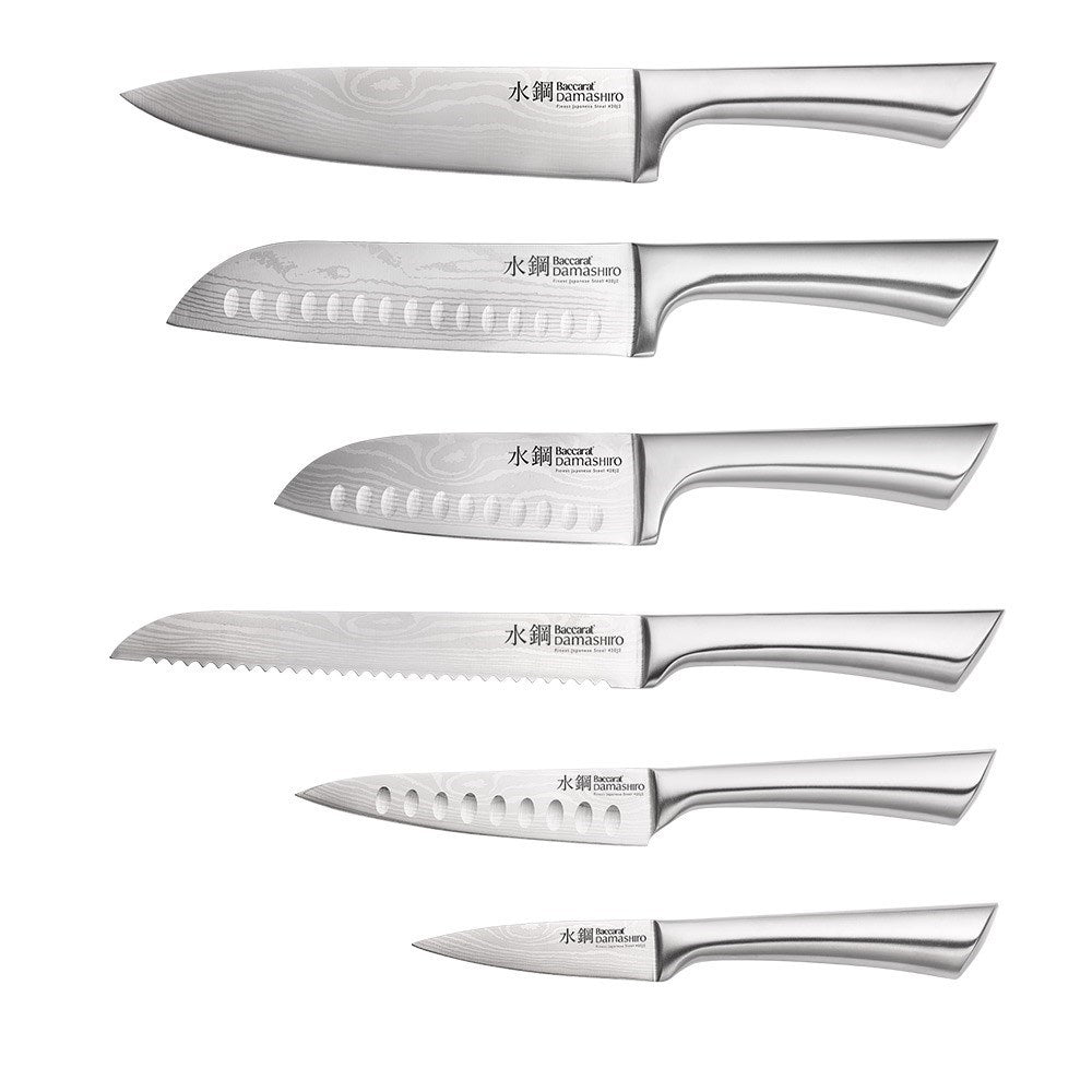• The Baccarat® Damashiro™ 7 Piece Mizu Knife Block Oak set contains: 1 x 20cm/8" Chefs knife, 1 x 20cm/8" Bread knife, 1 x 17cm/6.5" Santoku knife, 1 x 14cm/5.5" Santoku knife, 1 x 12cm/4.5" Utility knife, 1 x 9cm/3.5" Paring knife