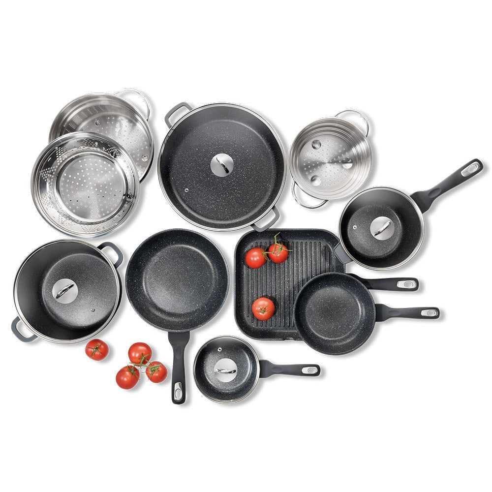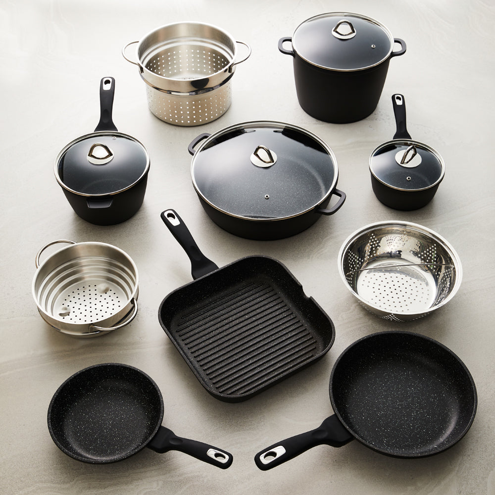 • Comprehensive cookware set is equipped with a 20cm Frypan, 26cm Frypan, 28cm Grill pan, 16cm Saucepan with lid, 20cm Saucepan with lid, 32 x 8cm Saute pan with lid, Stockpot with lid, a Pasta Insert and two Steamer Inserts