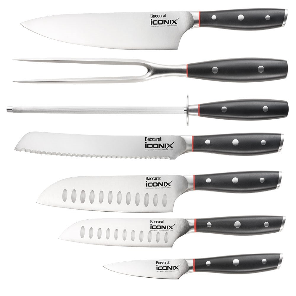 • The Baccarat® iconiX® Drenhen 9 Piece Knife Block set contains: 1 x 20cm Chefs Knife, 1 x 20cm Bread Knife, 1 x 18cm Santoku Knife, 1 x 17cm Carving Fork, 1 x 20cm Sharpening Steel, 1 x 12.5cm Santoku Knife, 1 x 12.5cm Utility Knife and 1 x 9cm Paring Knife. Housed in a stylish knife block to showcase your blades.