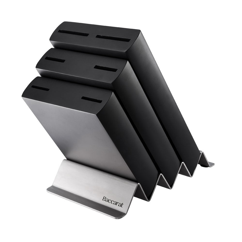 Bringing bladesmith perfection to your kitchen, the iconiX® Straub Knife Block by Baccarat® is a luxurious addition to your culinary collection. Inspired by the traditional German craftsman and bladesmiths. Baccarat® iconiX® blades are made from premium German Stainless Steel. The blades are produced with a controlled tempered process to ensure the best possible hardness, toughness and flexibility. Housed in a stylish black coated rubber wood knife block with a stainless steel base, these knives bring a touch of sophistication to any culinary space. Designed with professional handles, these knives assist to hold the hand safely away from the blade to ensure a contoured hold for effortless cutting and slicing. Enjoy a lifetime of quality culinary experiences with the premium iconiX® Straub Knife Block by Baccarat, backed by the Baccarat® Lifetime Guarantee!