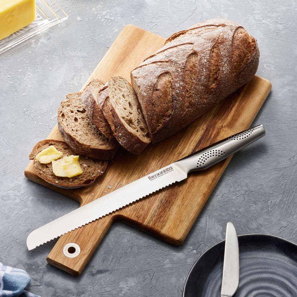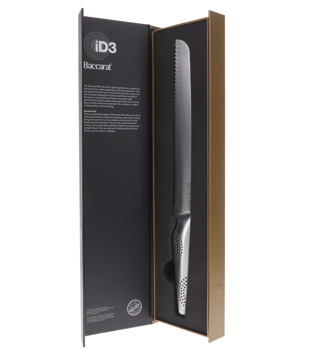 The Baccarat® iD3® 22cm Bread Knife has been specifically designed with a serrated blade edge to allow you to cut soft bread without crushing it. The serrations of the Baccarat® iD3® 22cm Bread Knife help when cutting food that is hard on the outside and soft on the inside such as bread and tomatoes. The Baccarat® iD3® 22cm Bread Knife is made from premium quality Japanese steel and features a razor sharp cutting edge that holds a greater edge retention. The durable stainless steel handle features iD3® Microdots at the major pressure points to ensure complete control and precision when slicing. The Baccarat® iD3® 22cm Bread Knife has been Rockwell Hardness tested to guarantee the highest level of hardness and tensile strength for superior quality.