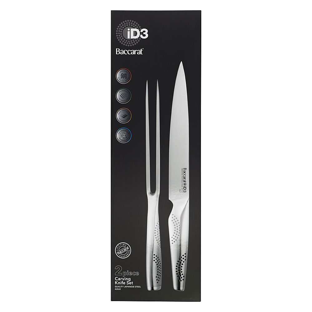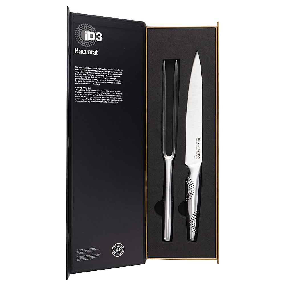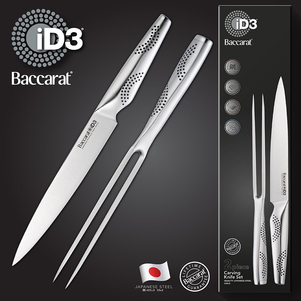 • The Baccarat® iD3® Carving set is perfect for carving and serving meats with ease. The knife’s curved blade profile help to follow contours and guide meat away from the bone. The carving fork is perfect for holding meat in place while slicing and helps to transfer food to plate. The Baccarat® iD3® Carving Knife Set contains: 1 x 20cm carving knife and 1 x 17cm carving fork.