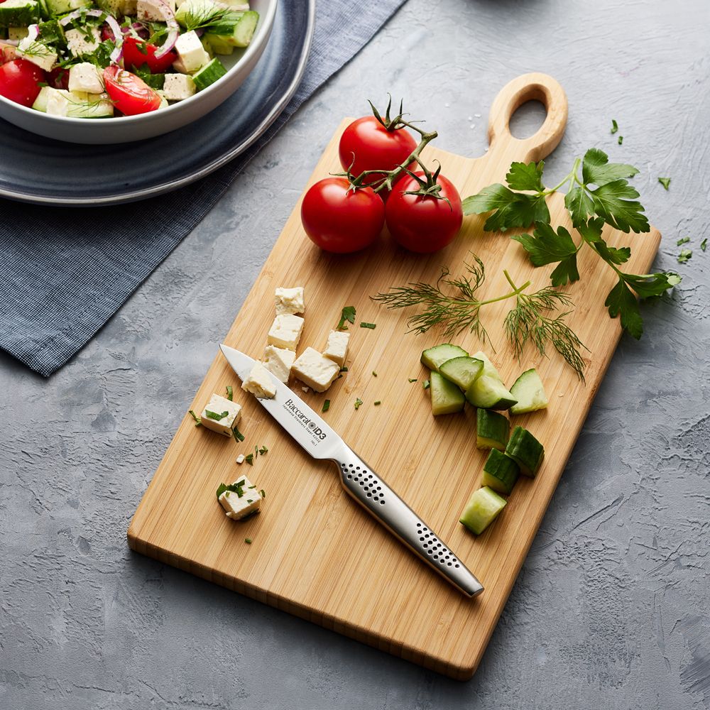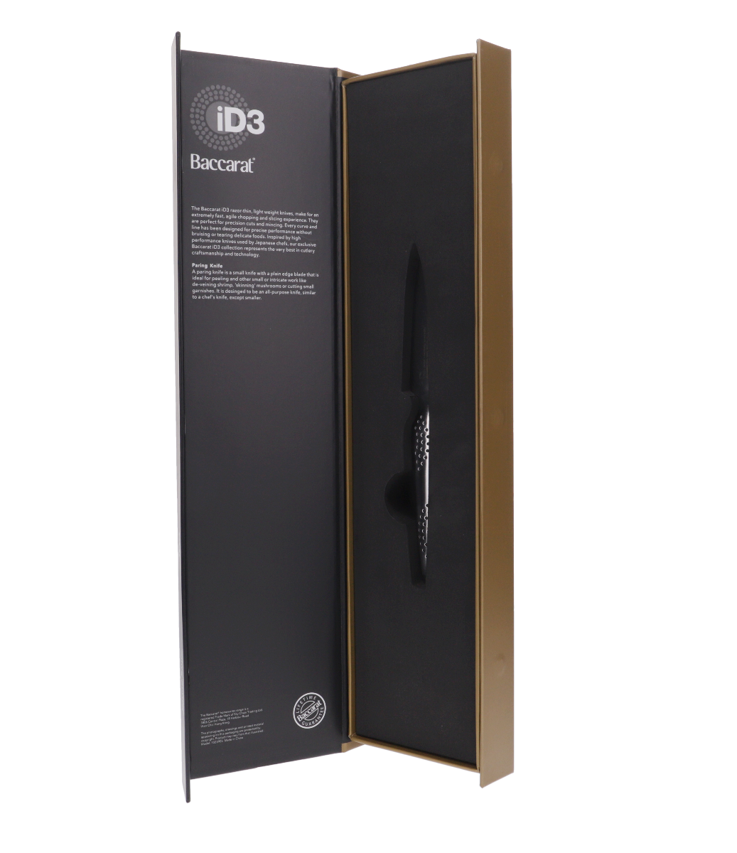 The Baccarat® iD3® 9cm Paring Knife is a small knife with a plain edge blade that makes it ideal for peeling and other small or intricate work just as de-veining shrimp, skinning mushrooms or cutting small garnishes. Constructed from premium quality Japanese Steel, the Baccarat® iD3® 9cm Paring Knife has been inspired by century old manufacturing techniques to create a super sharp cutting edge which holds greater edge retention for brilliant results every time. The handle of the Baccarat® iD3® 9cm Paring Knife boasts iD3® Microdots indented at the key pressure points of the handle which works to provide optimum grip, control and comfort when slicing and dicing. The Baccarat® iD3® 9cm Paring Knife has been ice hardened as well as Rockwell Hardness tested to level 53, to guarantee the highest level of hardness and tensile strength for superior quality that will last a lifetime.