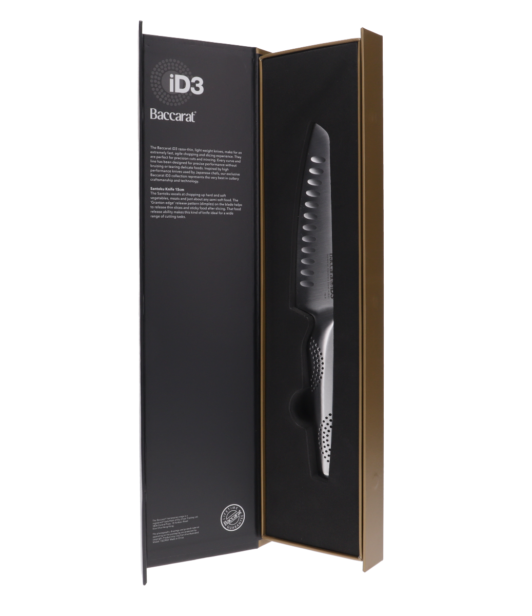 • The Baccarat® iD3® Santoku is #1 in the kitchen for Cutting, Slicing, Chopping, Dicing, Mincing and so much more. It is the perfect knife when cutting meats, slicing cheeses, and chopping or dicing vegetables and nuts. The recessed scallops situated above the blade's edge assists to release thin slices and sticky food after slicing.