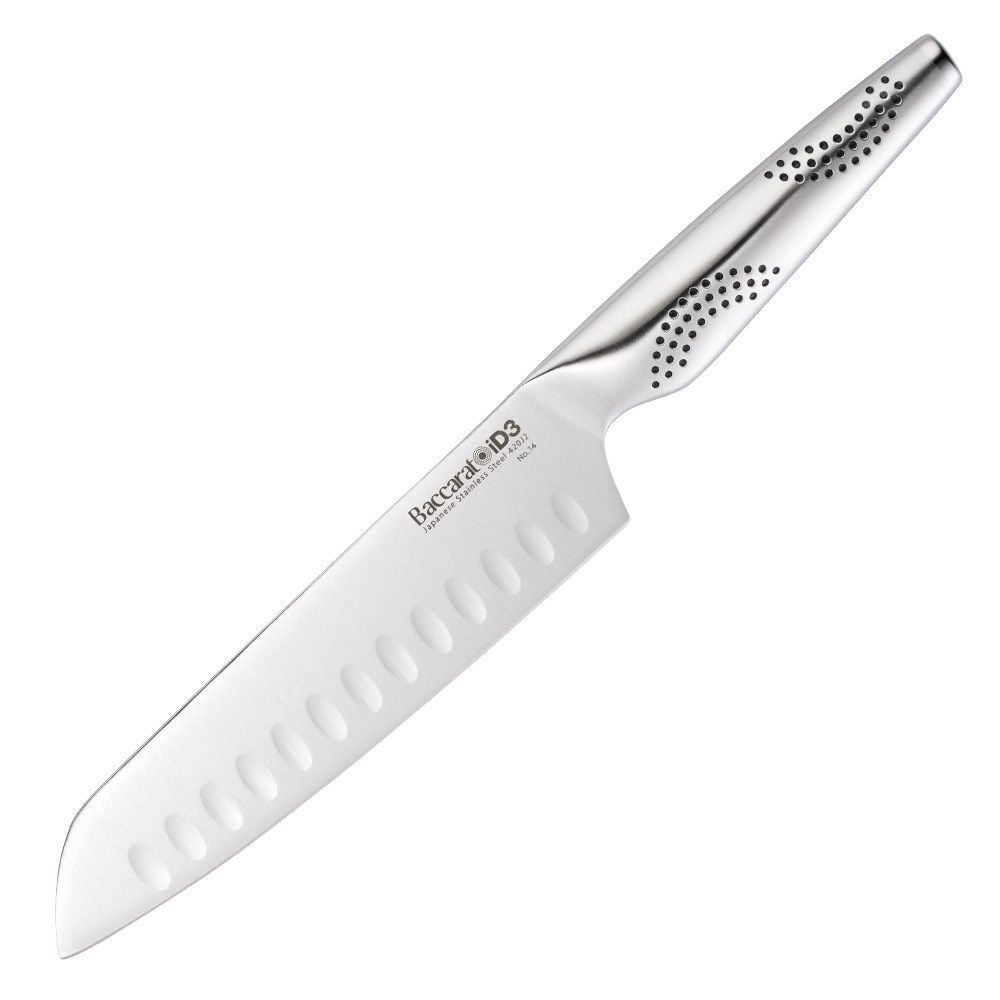 • The Baccarat® iD3® Santoku is #1 in the kitchen for Cutting, Slicing, Chopping, Dicing, Mincing and so much more. It is the perfect knife when cutting meats, slicing cheeses, and chopping or dicing vegetables and nuts. The recessed scallops situated above the blade's edge assists to release thin slices and sticky food after slicing.