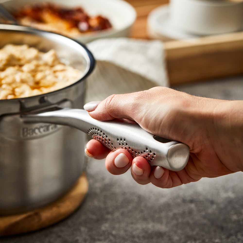 The Baccarat® iD3® SS Saucepan with Lid is an essential cookware item for every kitchen, composed of the finest grade 18/10 stainless steel and featuring a sturdy 5mm impact bonded base that works to distribute heat accurately eliminating hot spots. The ergonomically designed curved handles ensures the ultimate comfort and style, and functionally oven and dishwasher safe. Engineered with a sleek satin finish exterior, stay-cool cast stainless steel handles, and easy-to-clean mirror finish interior, the Baccarat® iD3® Saucepan will elevate everyday cooking to a professional level. For your convenience, the Baccarat® iD3® SS range is dishwasher safe and works with all cooktops, including induction.