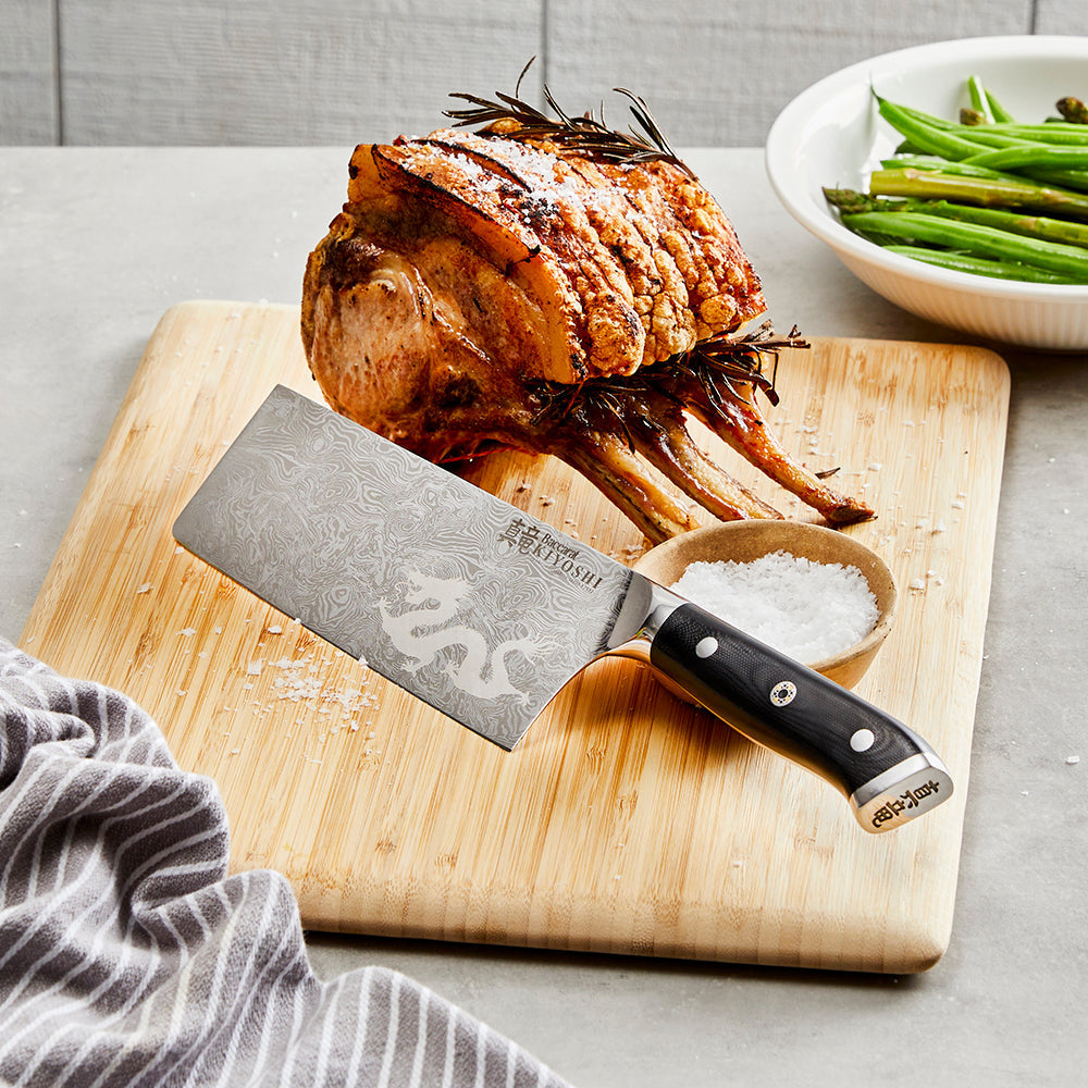 • The Baccarat® KIYOSHI® Cleaver Knife blade will change the way you handle meats. In addition to being designed for portioning of poultry and varied cuts of meats, the Cleaver is perfect for cutting through heavier root vegetables with ease. It is engineered to be perfectly balanced and weighted, making chopping a breeze.