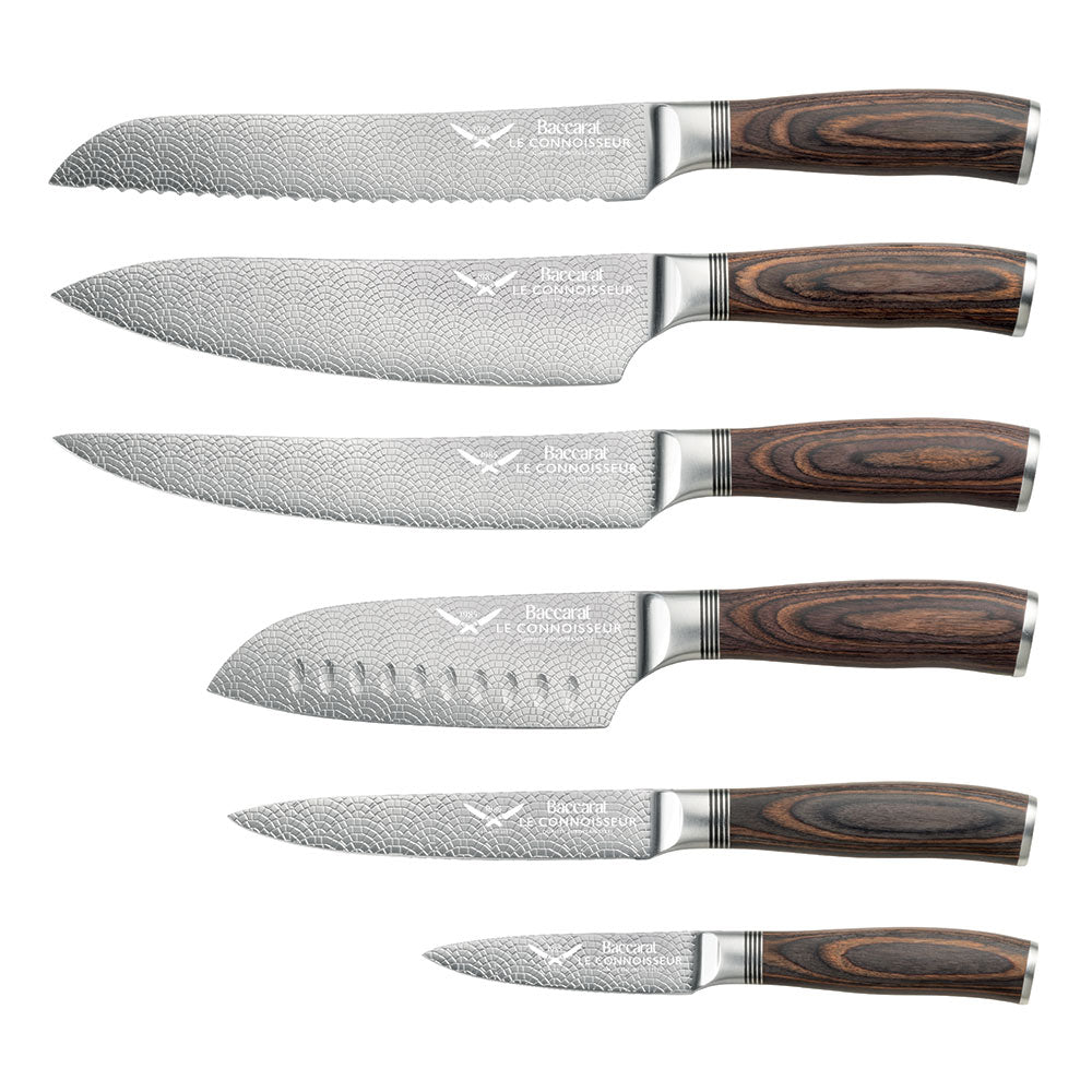 • Baccarat® Le Connoisseur™ Haute Knife Block includes: 1 x 9cm Paring Knife, 1 x 12cm Utility Knife, 1 x 14cm Santoku Knife, 1 x 20cm Chefs Knife, 1 x 20cm Bread Knife, 1 x 20cm Carving Knife