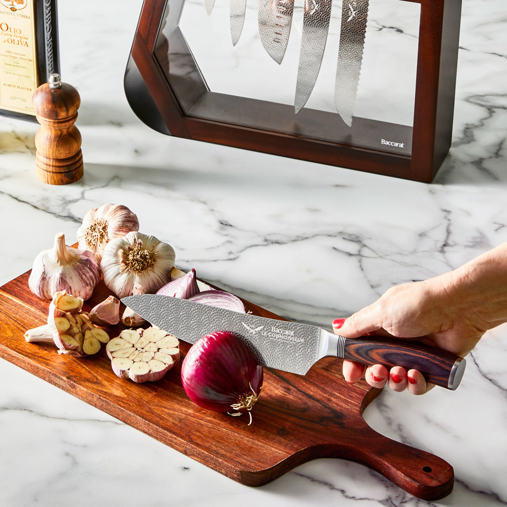Baccarat® Le Connoisseur™ knives feature the hallmarks of all the great European kitchens, so now the choice of renowned master chefs can be yours at home too. Each knife is engineered and tested to meet Rockwell 55 specification guaranteeing the blades hardness and optimum performance.