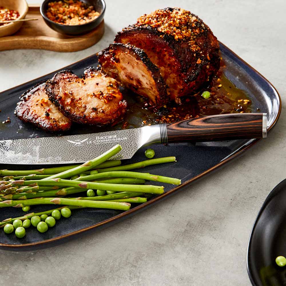 Exclusive to Baccarat® Le Connoisseur™ knives, each blade features a unique cobblestone design that pays homage to French architecture, emanating a vintage feel that also assists with the easy release of food. Durable Pakka wood handles are contoured for a comfortable grip and control, providing effortless cutting, slicing and assists with holding the hand safely away from the blade.