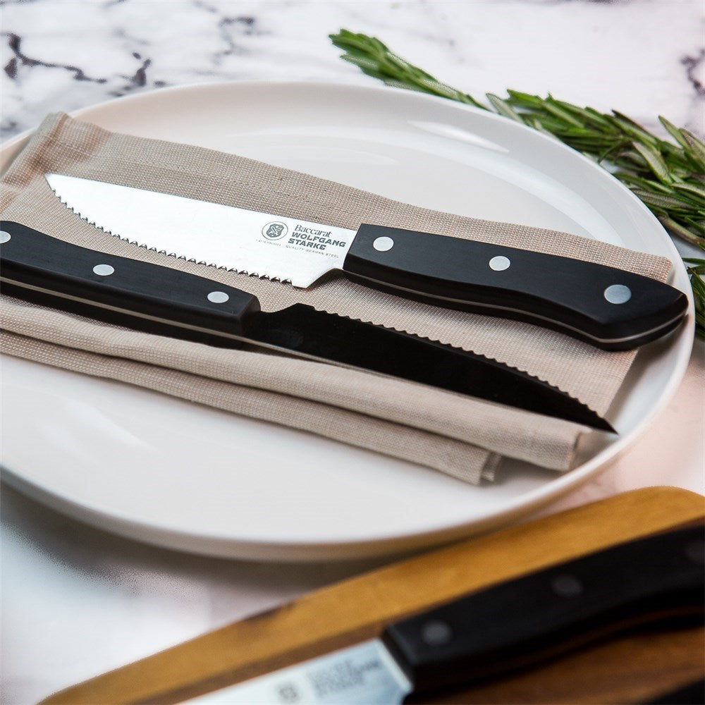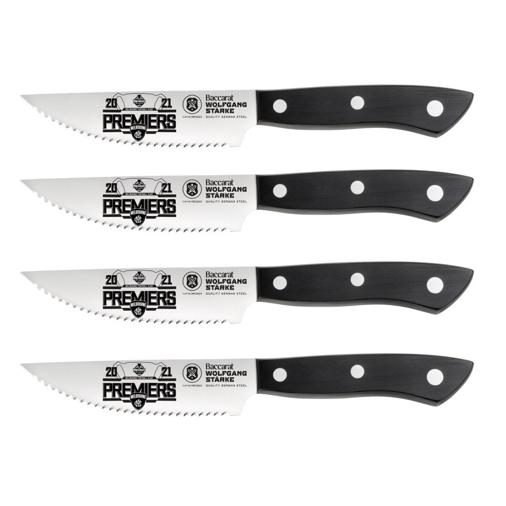 Commemorate a remarkable win and update your knife collection with the Baccarat® WOLFGANG STARKE® Steak 4 Piece in the design Melbourne Grand Final Cup. Boasting a Melbourne Demons design and etched with the words '2021 Premiers', this knife set is perfect for footy lover and steak enthusiast in your life. Engineered with serrations along the blade edge, these knives are carefully crafted to saw through meat without tearing or crushing, allowing for cleaner cuts. The Baccarat® WOLFGANG STARKE® blades are produced with a controlled tempered process to ensure the best possible hardness, toughness and flexibility. Hardened to ensure the sharpness of the blade, the WOLFGANG STARKE® Steak Knives by Baccarat® offer the perfect weight, control and balance. Presented beautifully boxed, this set makes a delightful gift for housewarmings, birthdays and other special occasions.