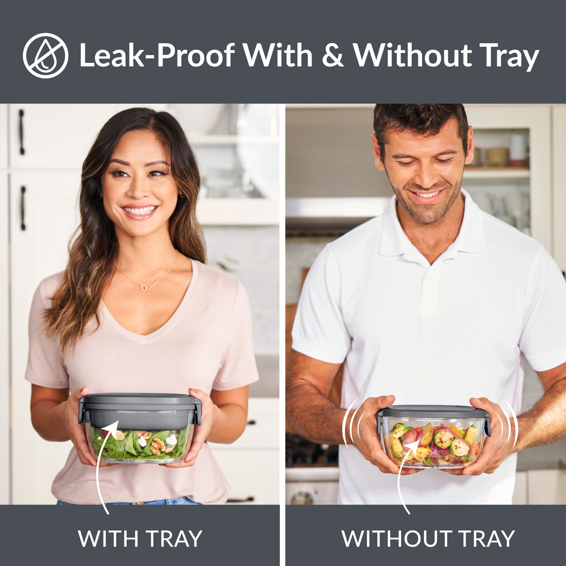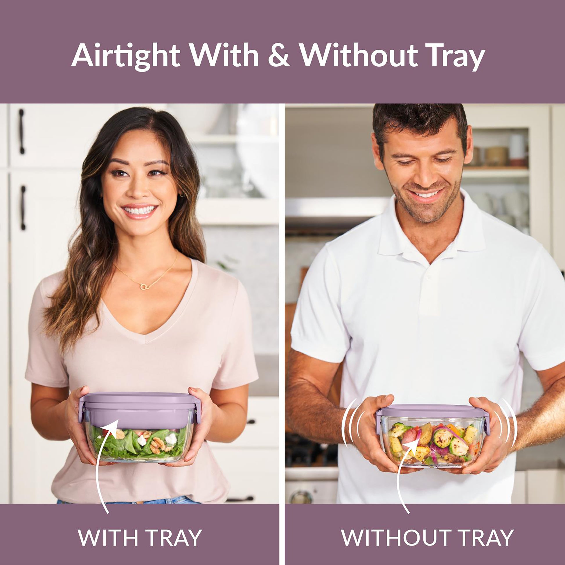 • Large, airtight salad bowl• Keep food fresh longer with this spacious 7.6 cup glass bowl to mix your salad ingredients. The unique silicone seal around the lid and locking clips prevent leaking when you use it without the tray