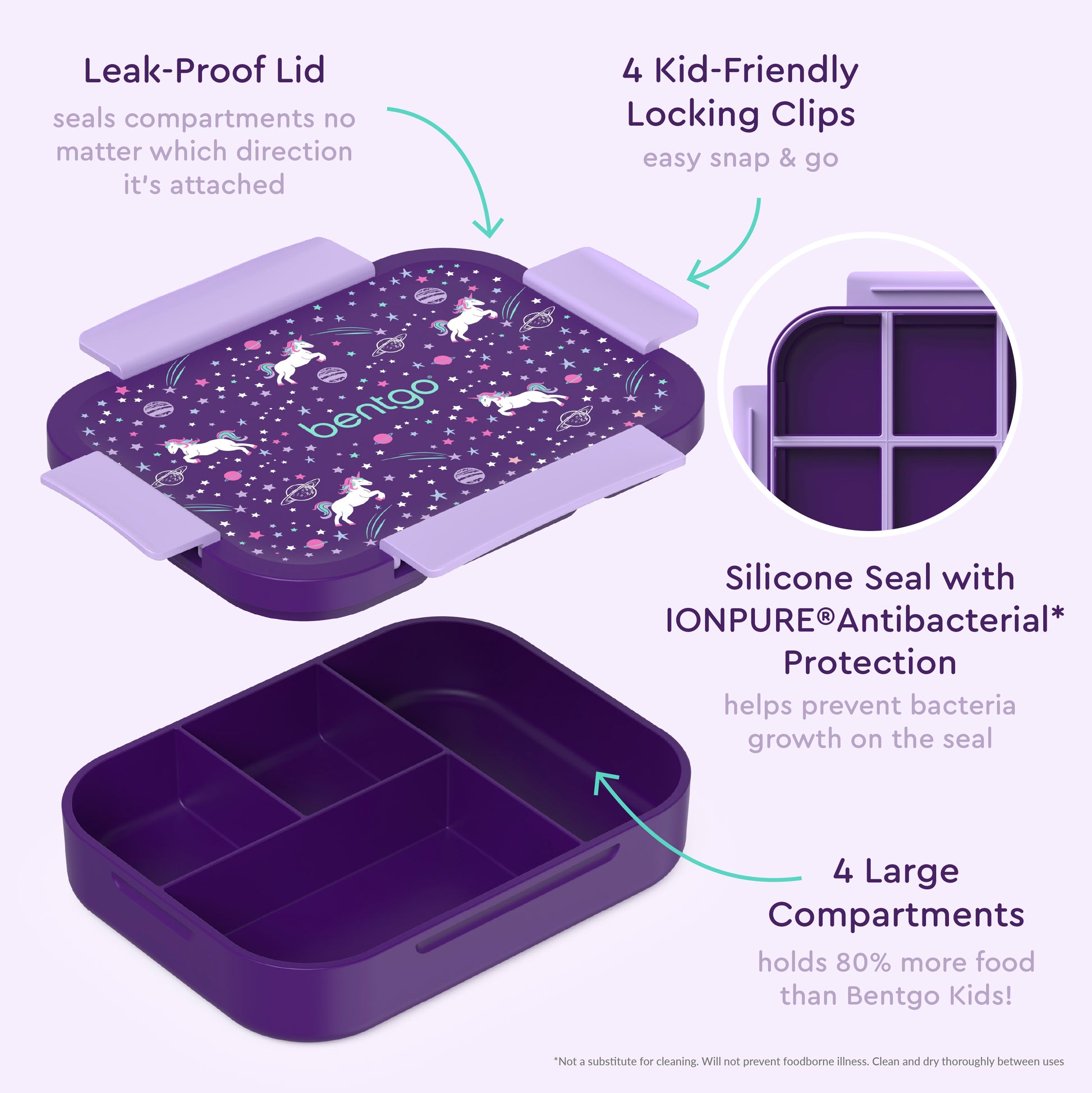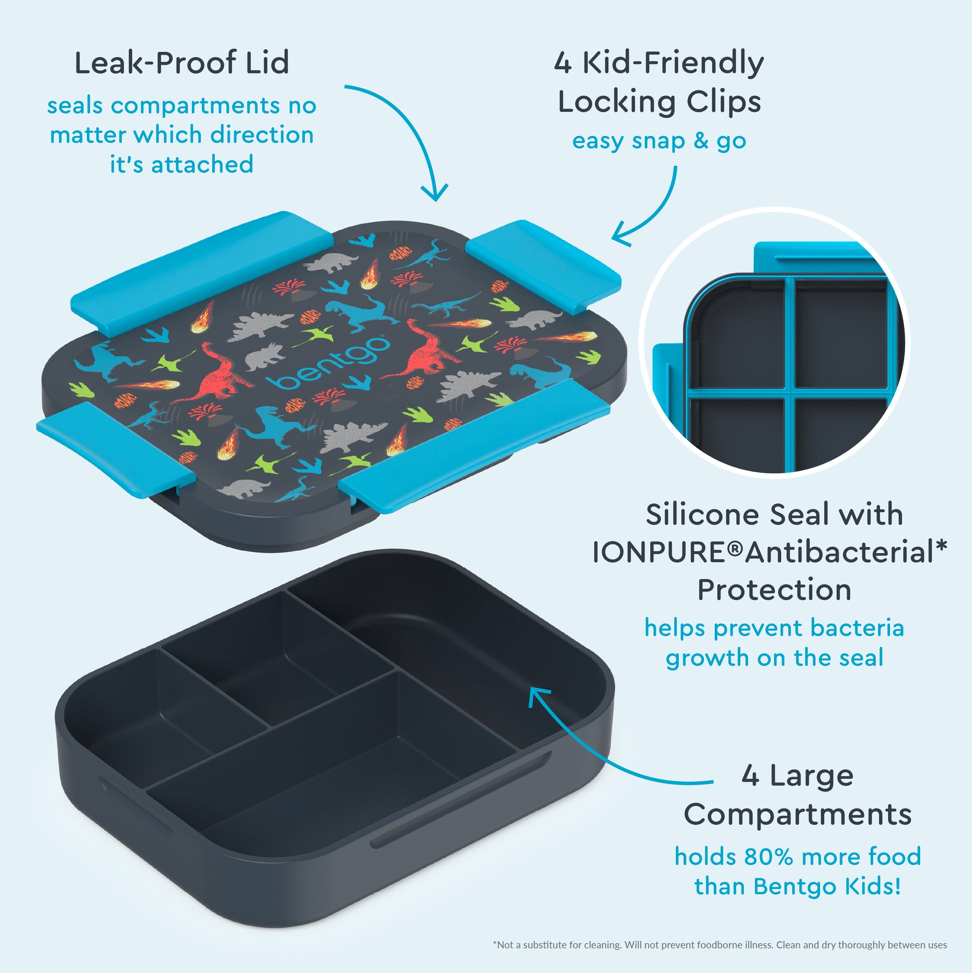 • The leak-proof lid perfectly seals each compartment within the tray (no matter which direction you attach it) to keep lunch bags and backpacks mess-free• Four kid-friendly locking clips keep food fresh and prevent meals from shifting during transport