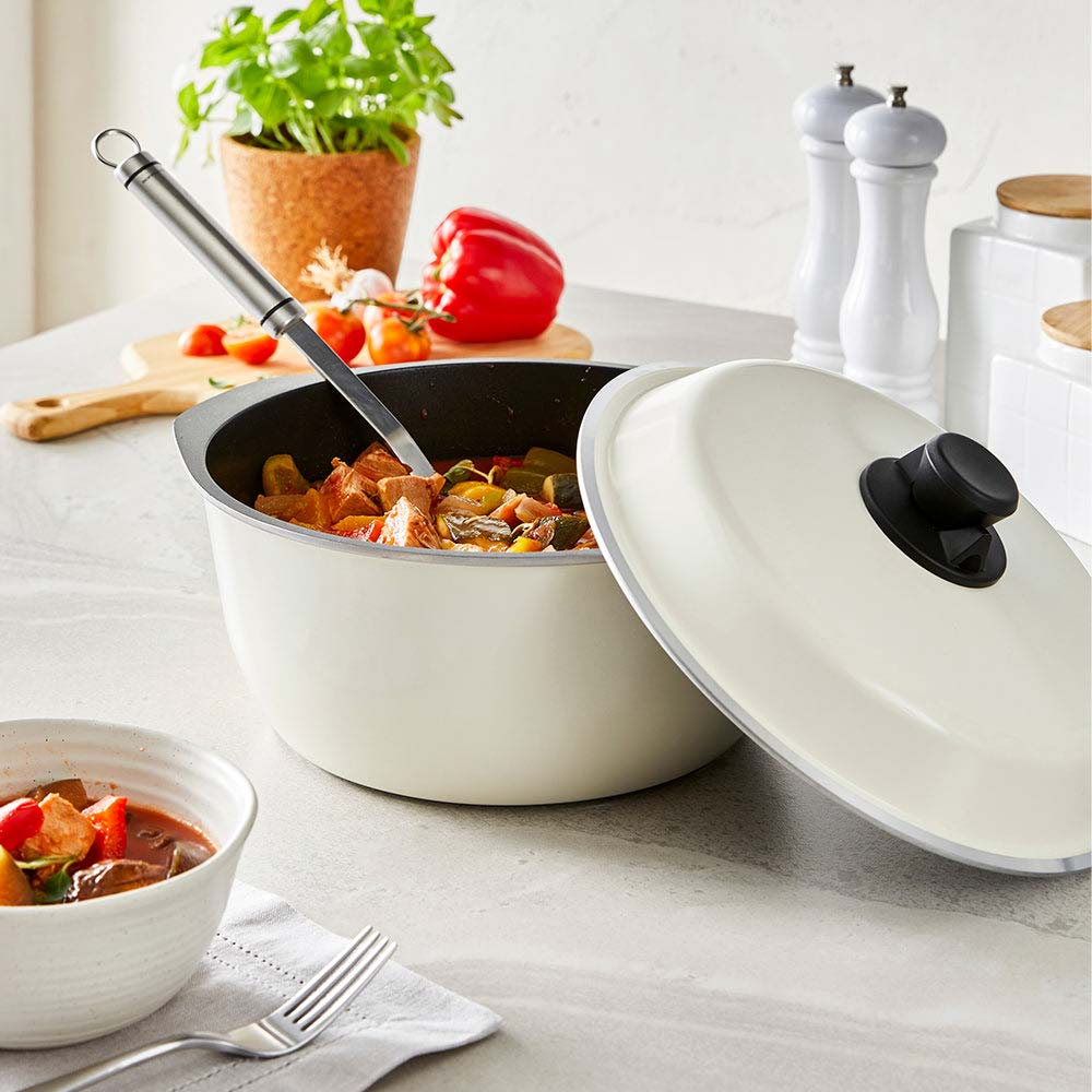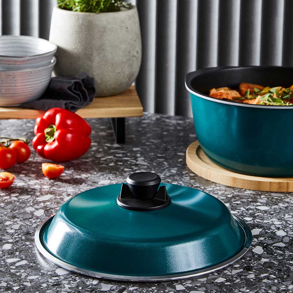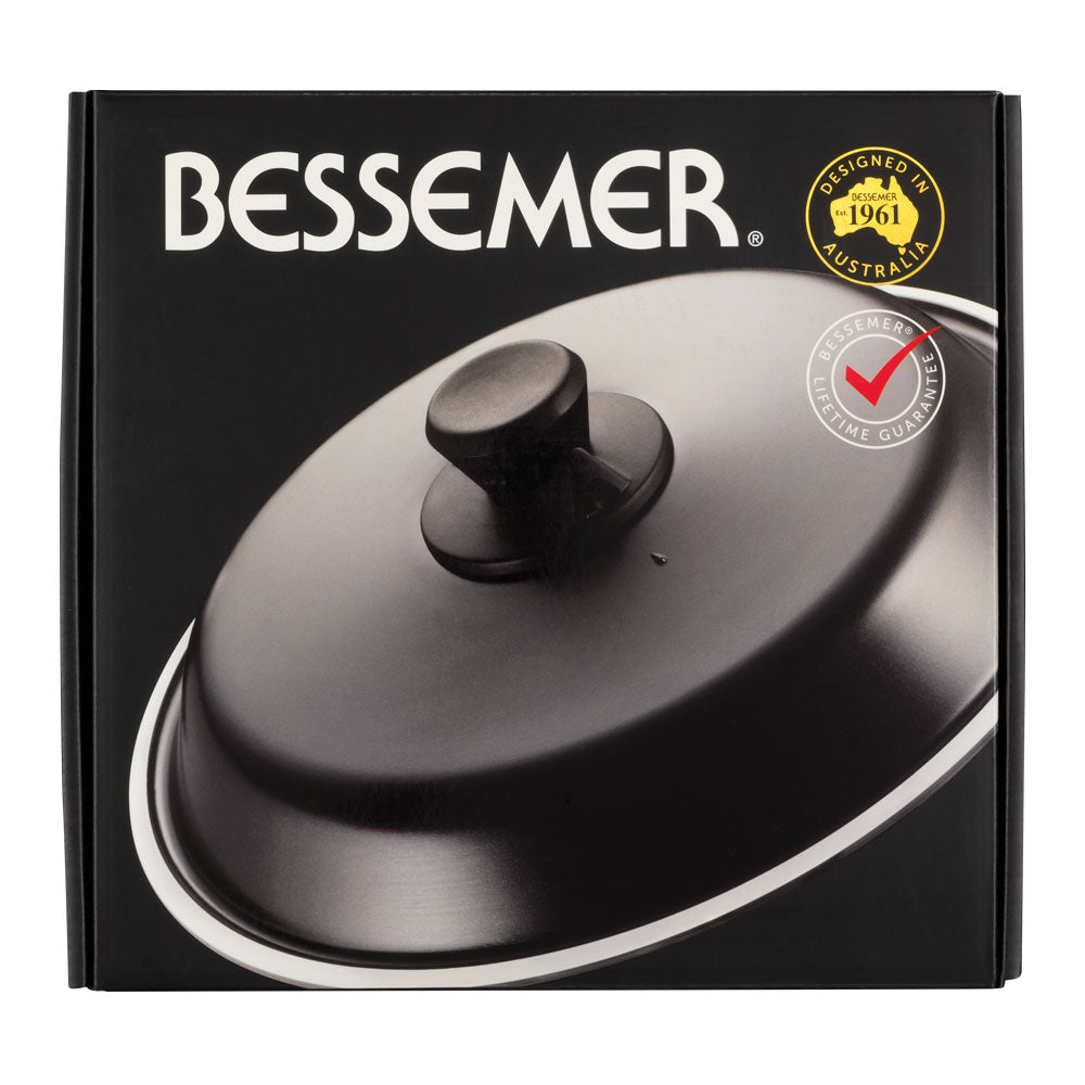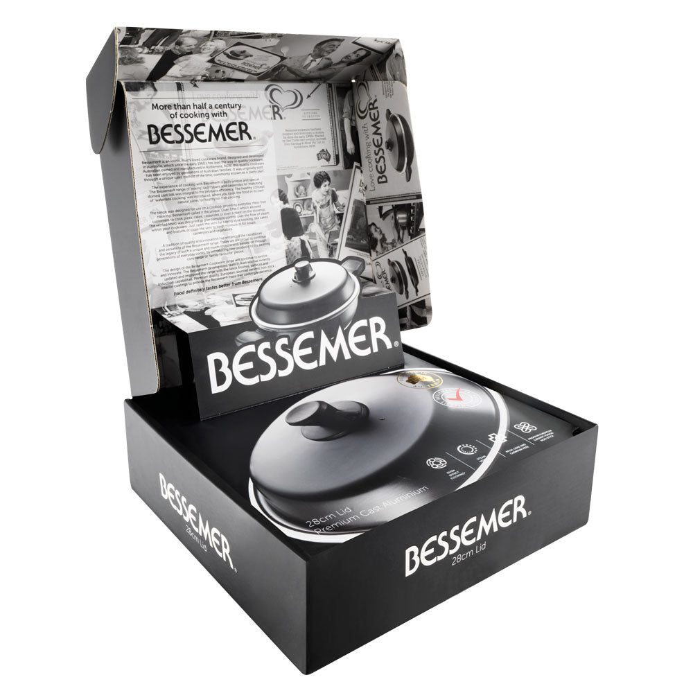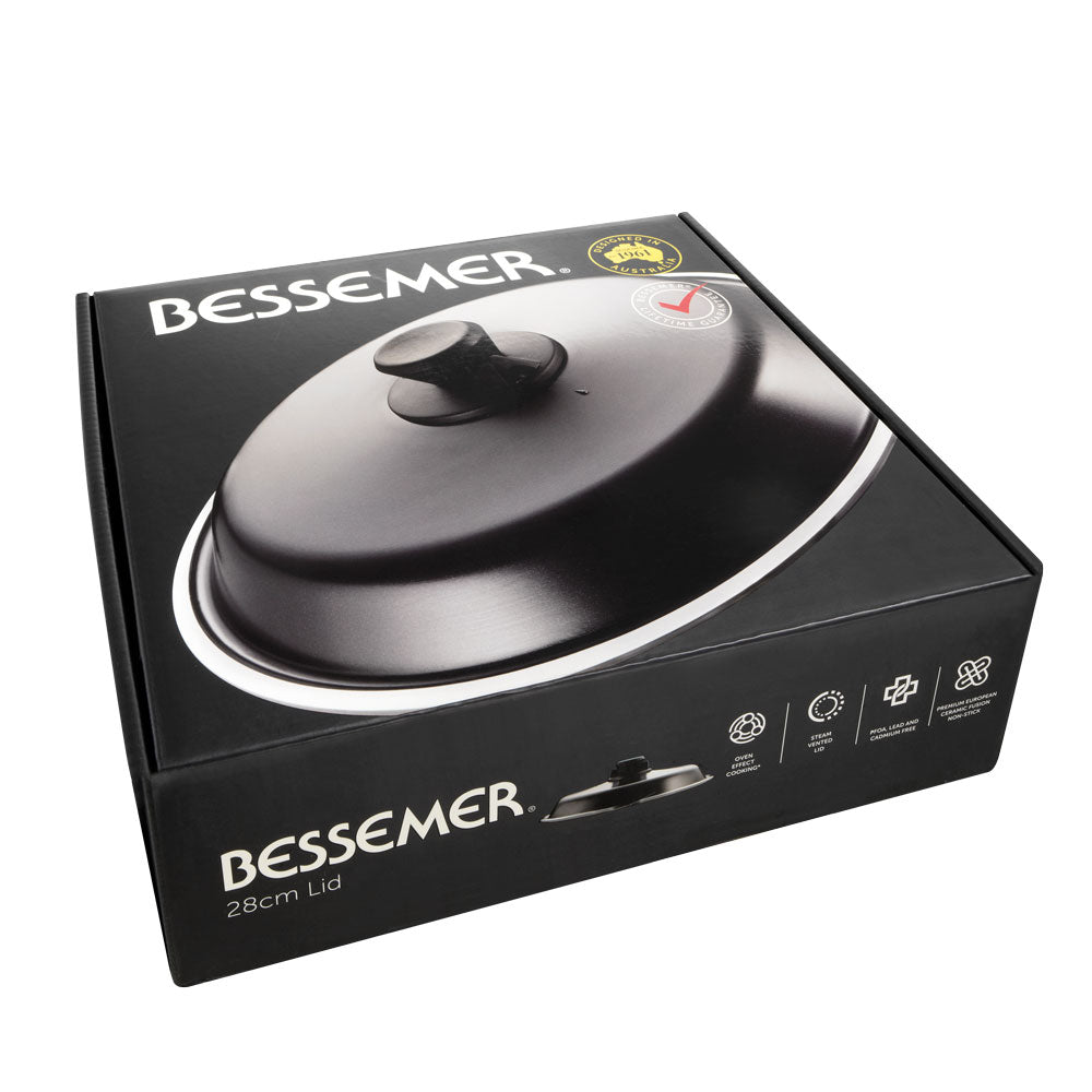 A kitchen staple for decades, nothing completes your kitchen quite like Bessemer® cookware and nothing completes your cookware like the Bessemer® Universal Lid. This must-have Bessemer® accessory is ideal for pairing with your Bessemer® cookware that has an 28cm diameter to help minimise mess and splashback while also allowing foods to steam, simmer, and boil. Featuring a modern high dome design with integrated steam ventilation, the Bessemer® Universal Lid provides perfect control over your cooking. Crafted from the highest quality food grade materials with ceramic coating to ensure unparalleled non-stick, the Bessemer® Universal Lid is truly made to last. Fitted with a stay-cool Bakelite knob, oven safe up to 180°C, that allows for safe handling, the Bessemer® Universal Lid is PFOA, Lead and Cadmium free for peace of mind. Food definitely tastes better in a Bessemer®.