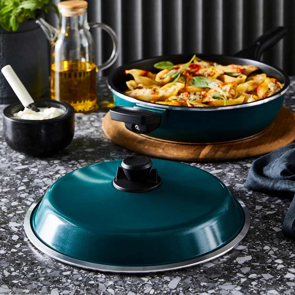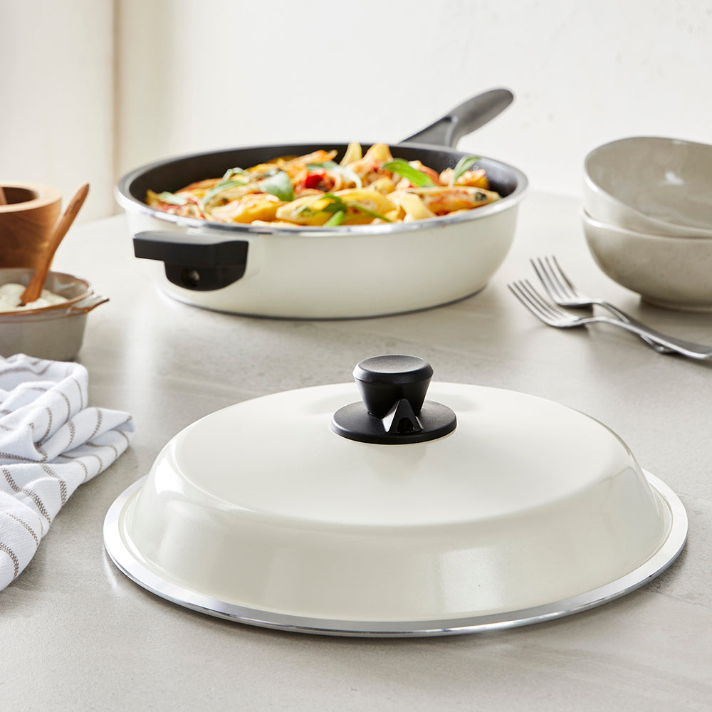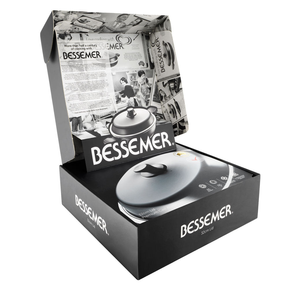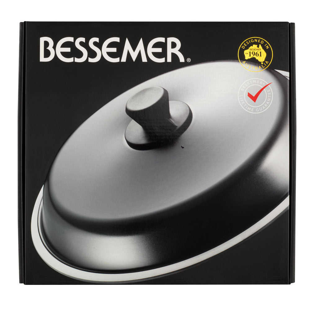 A kitchen staple for decades, nothing completes your kitchen quite like Bessemer® cookware and nothing completes your cookware like the Bessemer® Universal Lid. This must-have Bessemer® accessory is ideal for pairing with your Bessemer® cookware that has an 32cm diameter to help minimise mess and splashback while also allowing foods to steam, simmer, and boil. Featuring a modern high dome design with integrated steam ventilation, the Bessemer® Universal Lid provides perfect control over your cooking. Crafted from the highest quality food grade materials with ceramic coating to ensure unparalleled non-stick, the Bessemer® Universal Lid is truly made to last. Fitted with a stay-cool Bakelite knob, oven safe up to 180°C, that allows for safe handling, the Bessemer® Universal Lid is PFOA, Lead and Cadmium free for peace of mind. Food definitely tastes better in a Bessemer®.