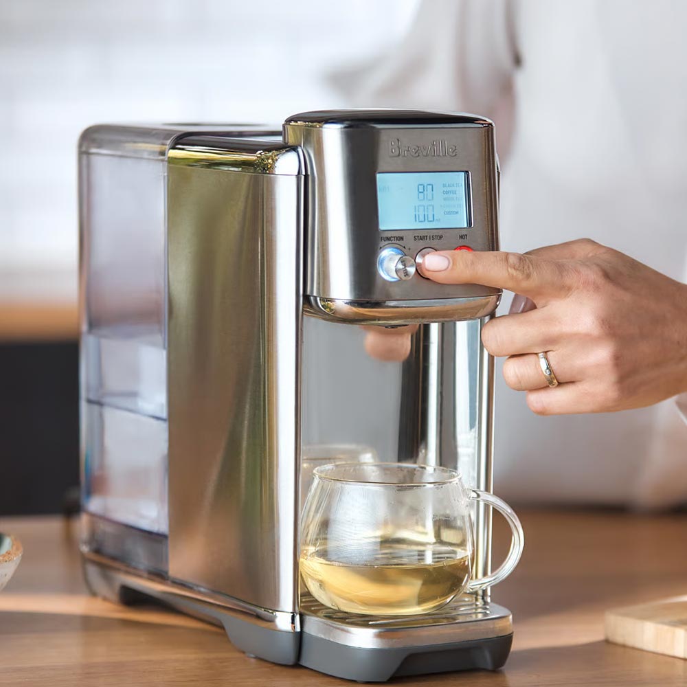 • Select your ideal temp & cup size. The hot beverage menu offers programmed ideal brew temperatures recommended for black, white, green tea, coffee and custom. Custom allows for manual selection of temperature, measured at the heating element, not from the spout (45°C-100°C) and volume (100mls-1200mls). No water wasted. The heating element instantly heats only the amount of filtered water selected