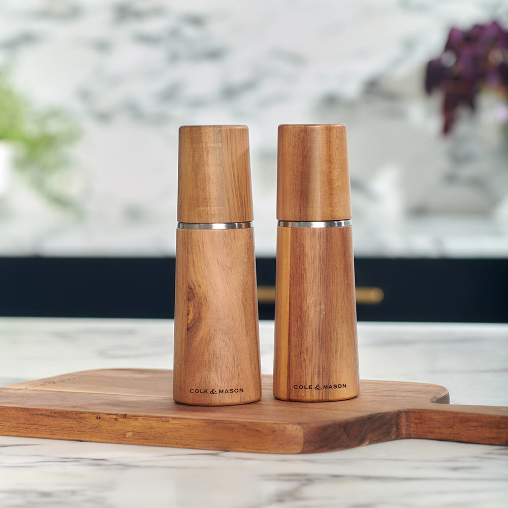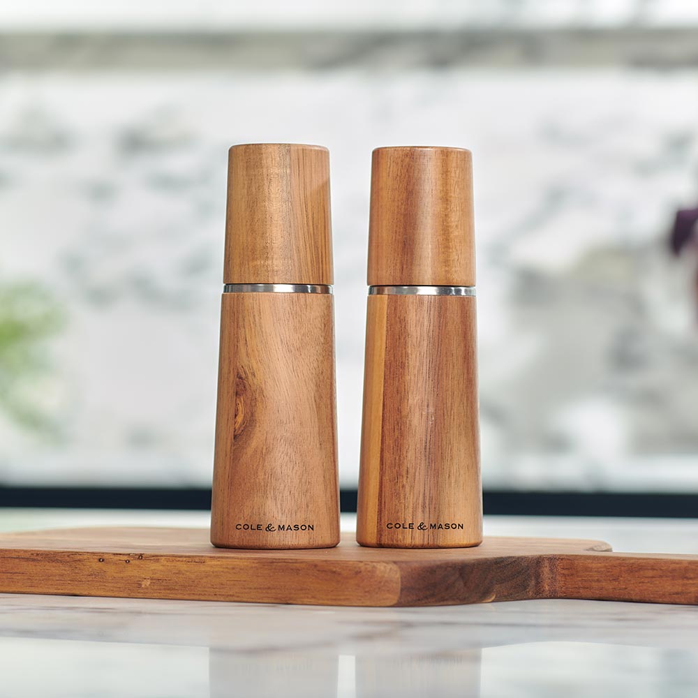 • Classy, minimalist salt and pepper mill set made from sustainably sourced acacia wood• Featuring the Cole & Mason Precision+ carbon steel mechanism and sharp ceramic mechanism for salt that deliver maximum flavour release from every turn