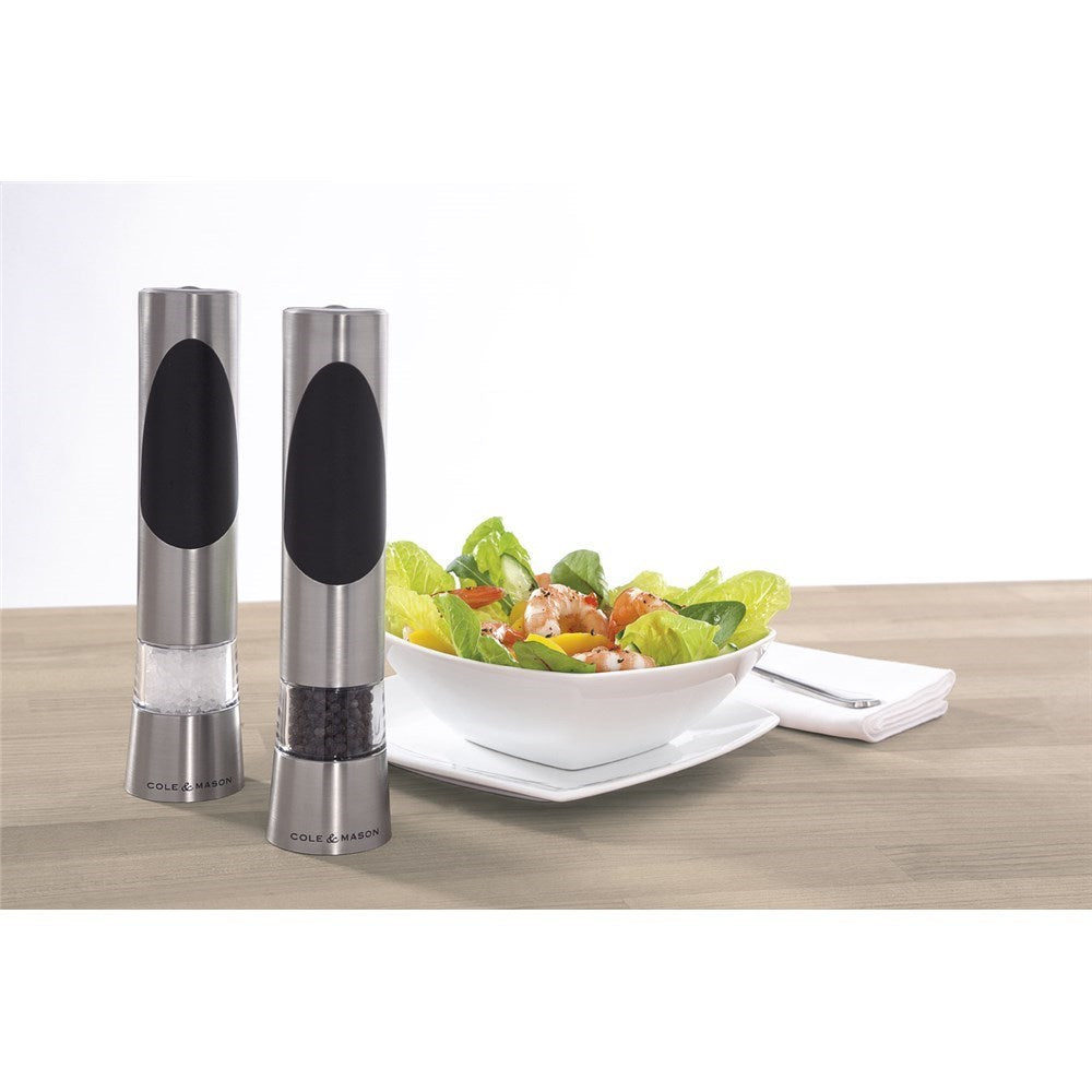 Bring a touch of fine dining elegance to your everyday meals with the Cole & Mason Richmond Electronic Salt & Pepper Mill Gift Set. Boasting a sleek stainless-steel finish, this set makes a stylish addition to any dining table. The Richmond Electronic Salt & Pepper Mill Set offers maximum comfort through the soft touch grip and easy top button. Highly functional, this set offers simple one-handed operation for effortless grinding. Adjust the grind to suit your tastes and enjoy award winning precision mechanism grinding.