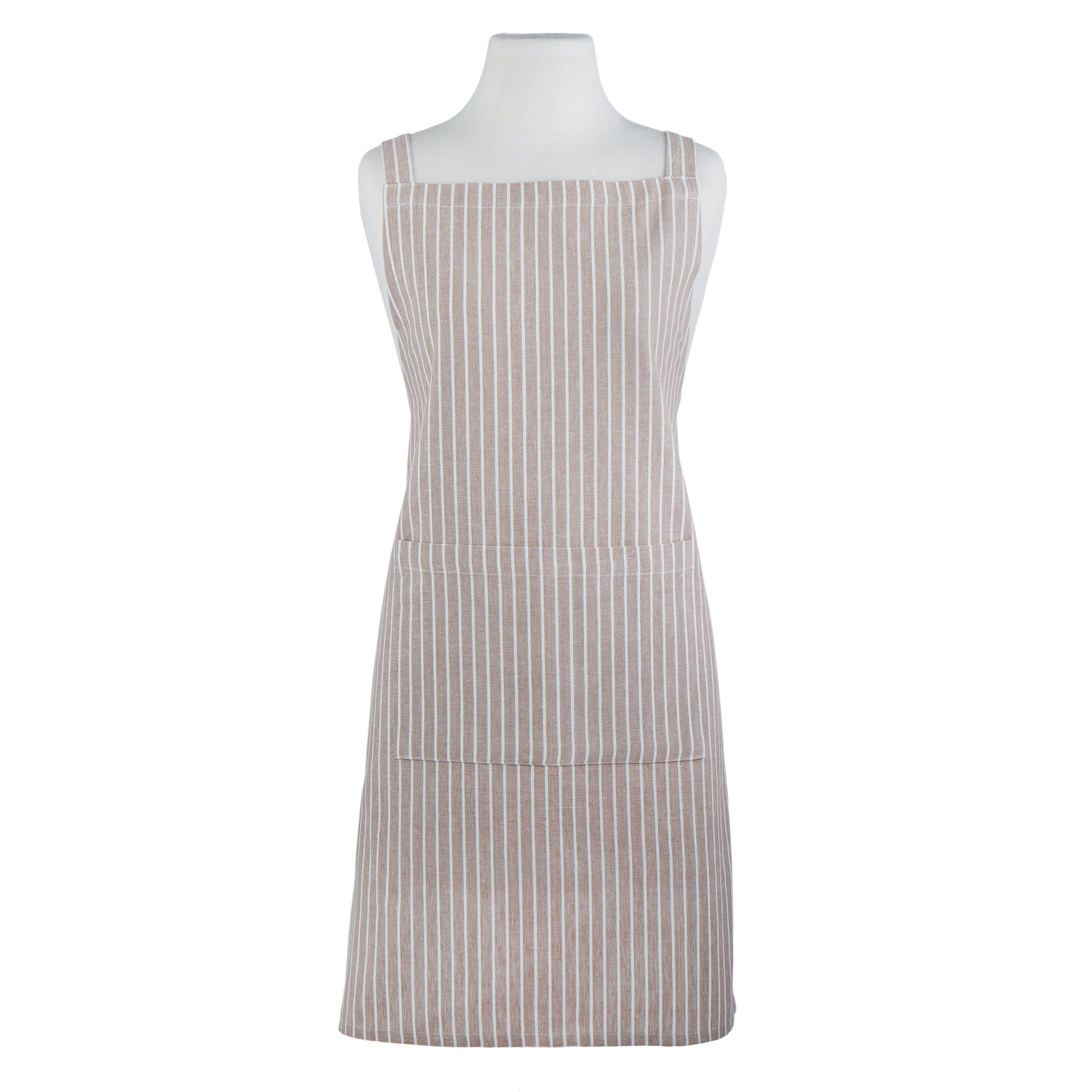 Our range of D&W aprons protects your clothing from splashes and stains while keeping you looking stylish while cooking. This Butcher Stripe Apron is the perfect accessory when entertaining friends and family around the BBQ. Made from 100% cotton, it features a vertical butcher shop-style taupe and white striped print that conjures up images of countryside summers. It has a convenient neck strap and tie-back waist with a large front pocket. This range comes in three different colours with matching oven glove, double oven glove and tea towel – mix and match them all to complete the look! Liven up your cooking with this colourful Butcher Stripe Apron from Davis & Waddell.