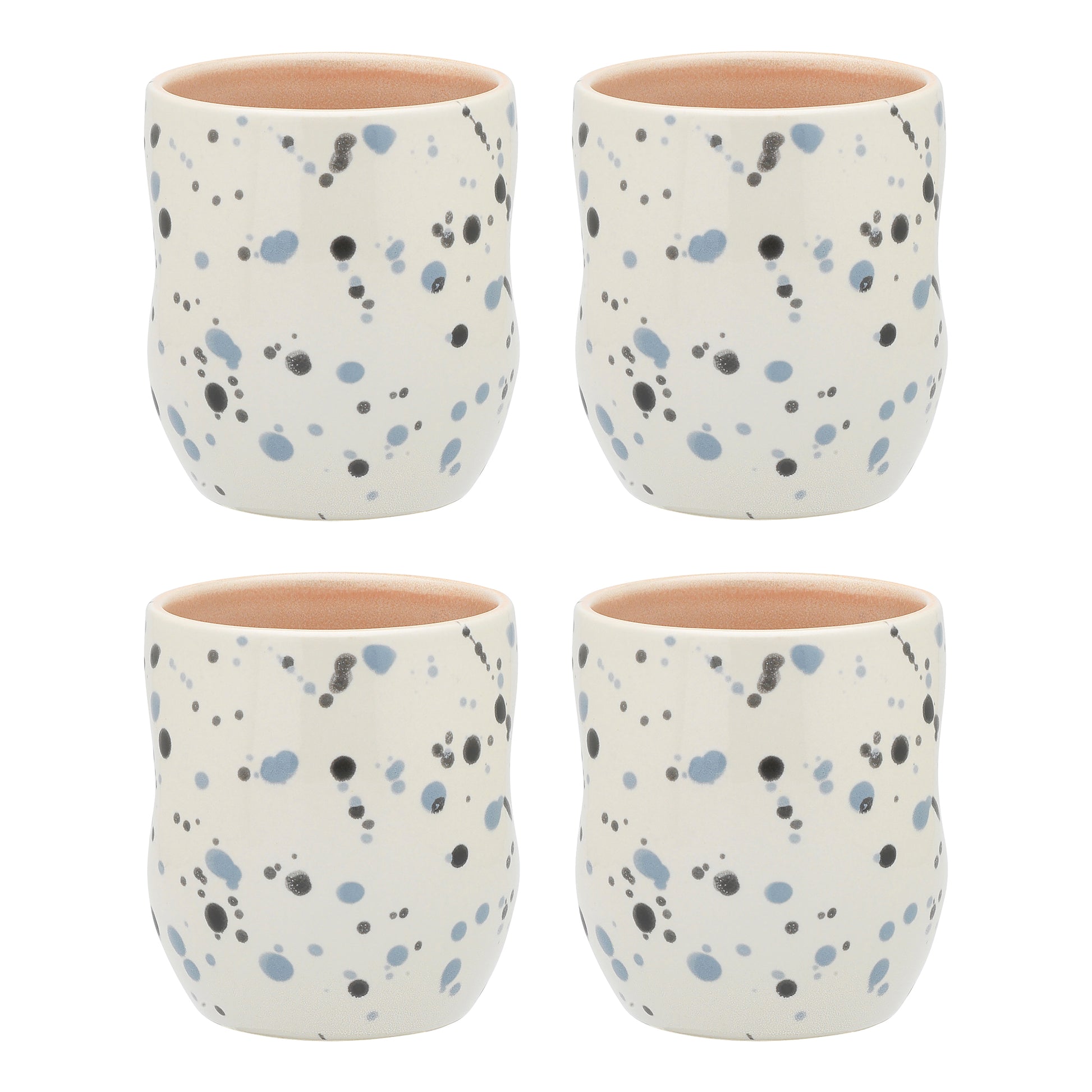 Sunset warmth radiates across Ecology’s Dusk collection. The Ecology Dusk Set of 4 Cuddle Mugs 280ml are a high gloss, stoneware set of 4 cuddle mugs designed by Sarah Strickland, it features a warm haze of soft peach-pink tones washed across the inside of each piece. The organic shape is accentuated by fine edges, while the outer surface displays splattered ink-drops in a mix of moody blue hues against a milky white base..