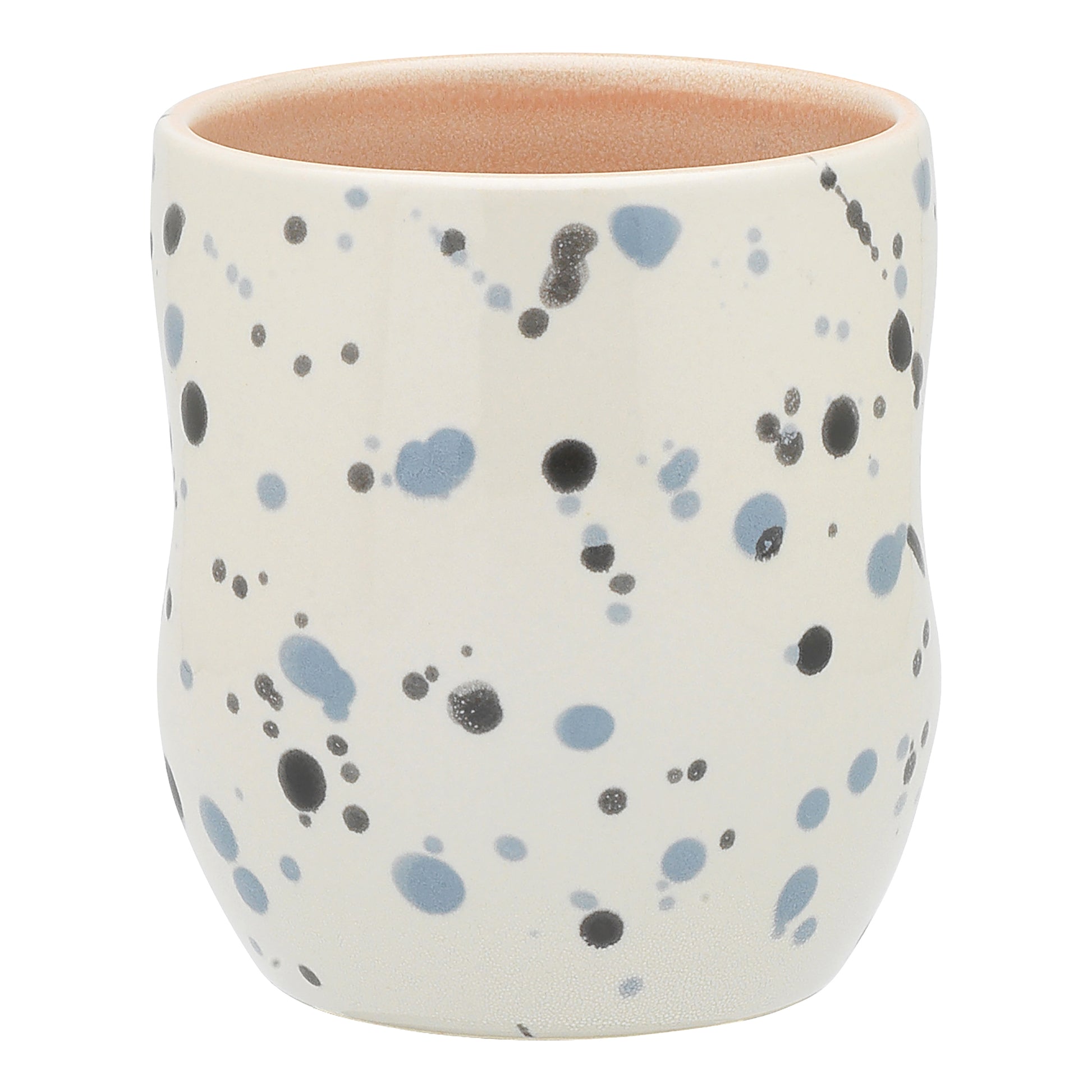 • Warm peach-pink tones wash across the inside of the mugs and splattered ink-drops in a mix of moody blue hues decorate the exterior