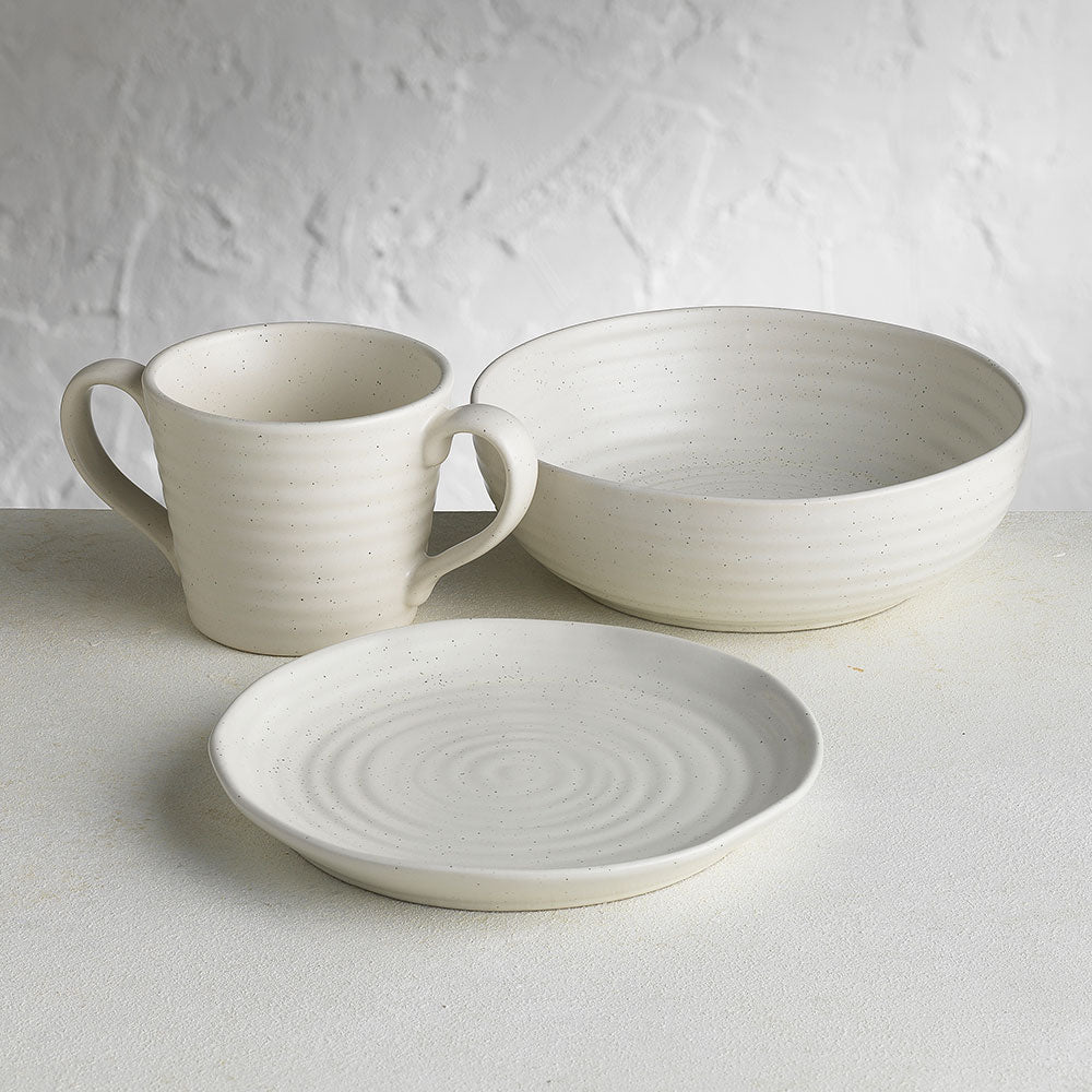 Designed to delight little ones, the Ecology Ottawa Kids 3 Piece Set Calico offers a miniature take on the stylish stoneware Ottawa collection. Perfect for small hands, this delightful set comprises of a coordinating plate, bowl and dual-handled mug that seamlessly caters for breakfast, lunch and dinner. Designed in Australia by homewares brand Ecology, the Ottawa Kids 3 Piece Set Calico boasts a gently ridged shape, featuring a soft speckle design and a dimpled, tactile finish. Packaged in a full-colour gift box, the Ecology Ottawa Kids 3 Piece Set Calico presents a wonderful, memorable gifting opportunity.