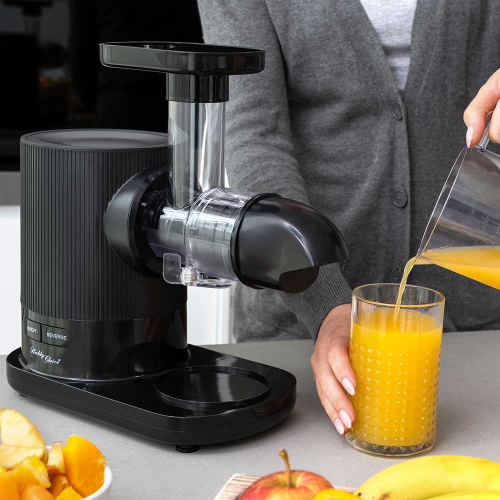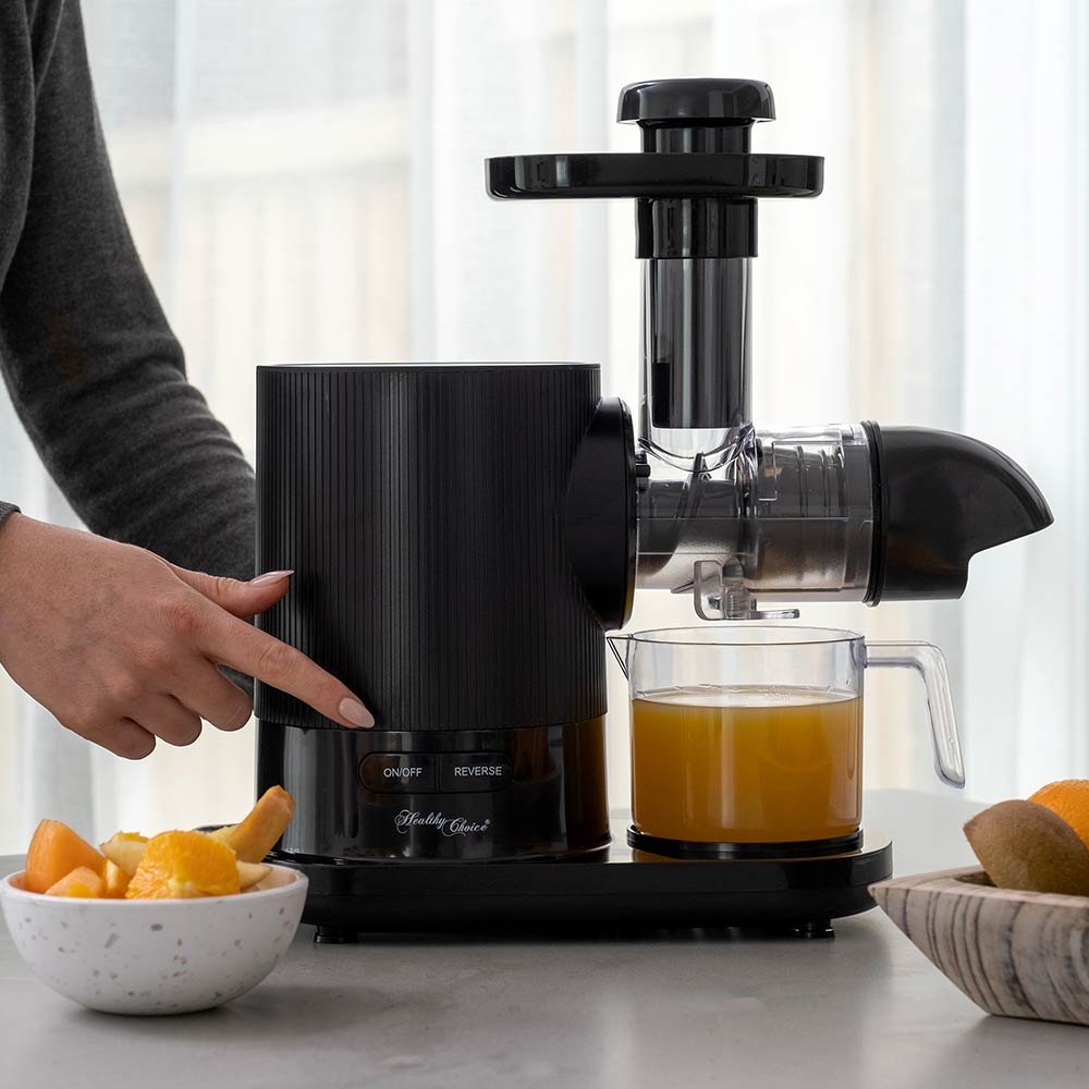 This Cold Press Slow Juicer can form your favourite combination of fruits and vegetables into a fresh pressed juice with up to 20 minutes continuous use. Juicing provides many benefits because it retains most of the vitamins, phytonutrients, and minerals essential for a daily recommended diet. The juicing process is simple- it slowly squeezes, liquefies, and strains your fresh produce with minimal heat and friction exposure to deliver high quality fresh pressed juice straight into the included 500ml juice cup. The leftover fruit and vegetable pulp can dispense straight into the included 500ml pulp container. The powerful 150-watt motor on this juicer is strong enough to press the hardest fruits and vegetables while providing consistent fresh juice through the fine strainer. Maintaining a peaceful atmosphere is no issue for the kitchen or office cafeteria because this slow juicer runs at low speed and low noise levels during all steps of the operation. The wide feeding chute allows large, 4cm chunks of fruits and vegetables to be juiced. Fresh foods will guide through without any extra force, allowing you to effortlessly make beautiful and delicious creations with a high juice yield with minimal foaming. The non-slip grip pads on the bottom make for happy and safe juicing without the worry of any slips or spills. When it is time for clean-up, simply pour water into the chute and put the juicer into reverse mode to wash away excess fibres and pulp. The included cleaning brush can help assist with cleaning in between every nook and cranny. Start your day the healthy way and let this beautiful, sleek black Cold Press Slow Juicer guide you to a fresh lifestyle.".