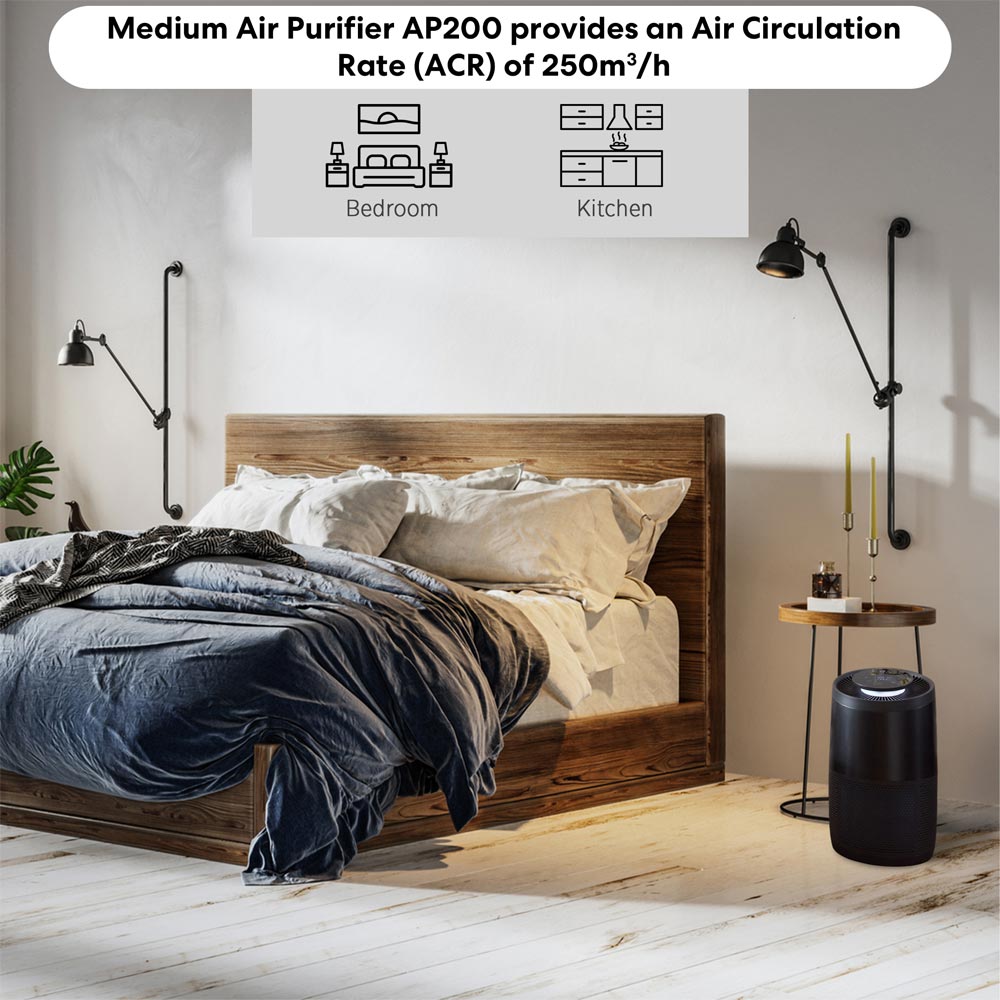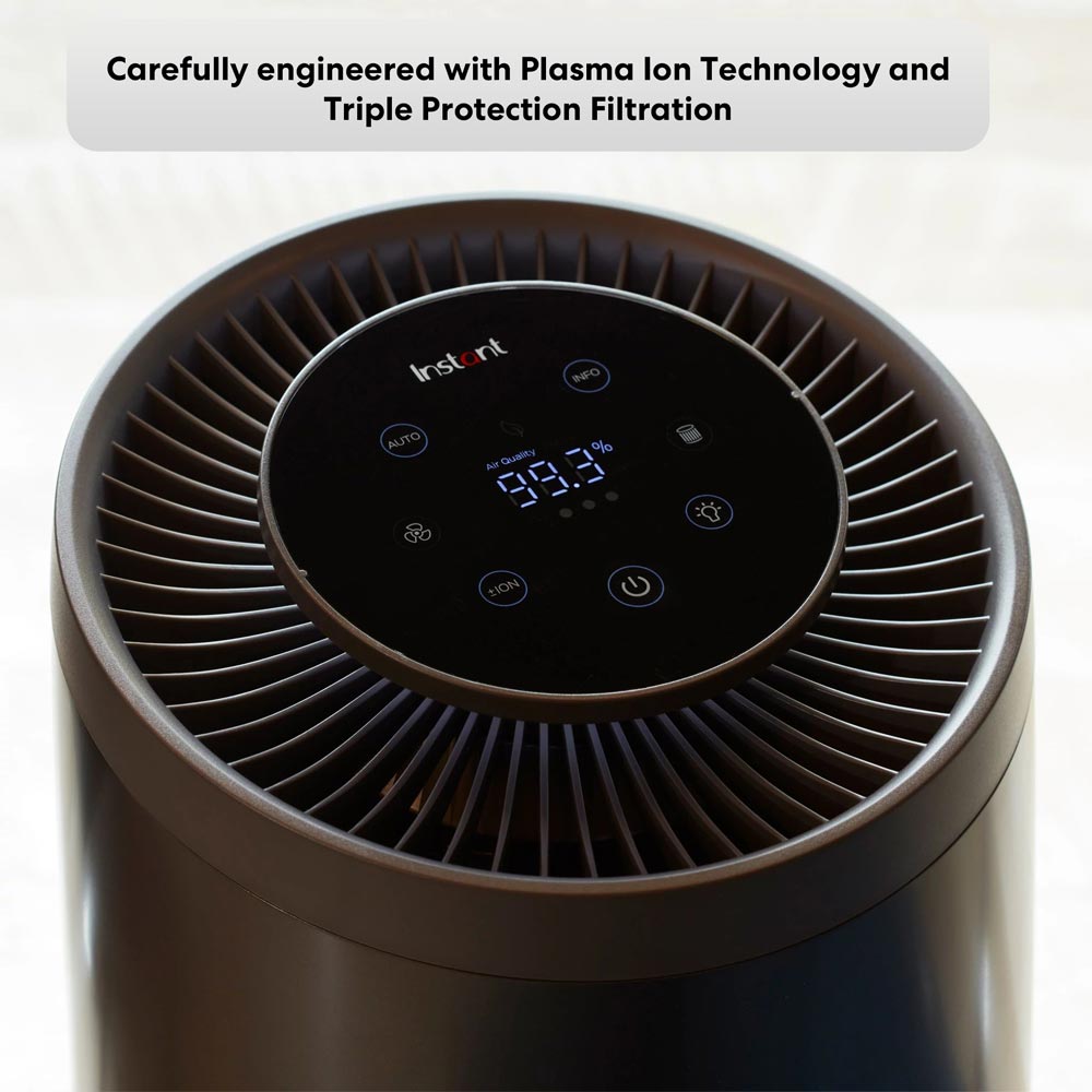 The Instant Air Purifier AP200 Charcoal is a compact, powerhouse solution for pure and revitalising indoor air. Engineered to eliminate 99.97% of ultrafine airborne impurities, allergens, and viruses, this purifier is perfect for medium sized spaces like kitchens, home offices and bedrooms. Harnessing Plasma Ion Technology, the purifier releases positive and negative ions to effectively neutralise pollutants. Smart sensors continuously monitor air quality, adjusting the fan speed automatically. Enjoy immediate results, with the air completely recycled five times per hour. The Night Mode ensures tranquillity by dimming lights and reducing noise, while Eco Mode optimises energy efficiency. With Auto Mode adapting to changing conditions and a coloured air quality indicator for quick assessments, the Instant Air Purifier AP200 Charcoal guarantees a breath of fresh air in your surroundings.