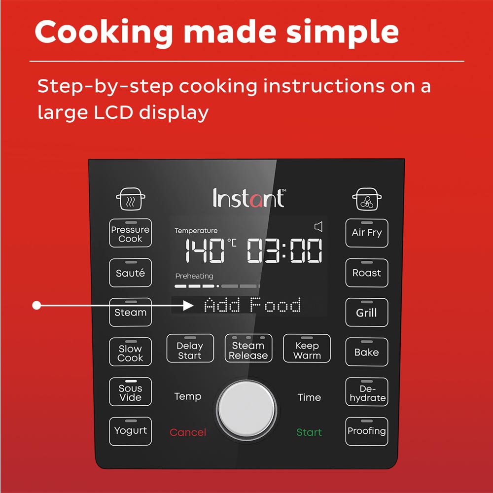 - 13 cooking techniques in 1: pressure cook, air fry, sauté, steam, slow cook, sous vide, roast, grill, bake, dehydrate, yogurt, proof, and keep warm