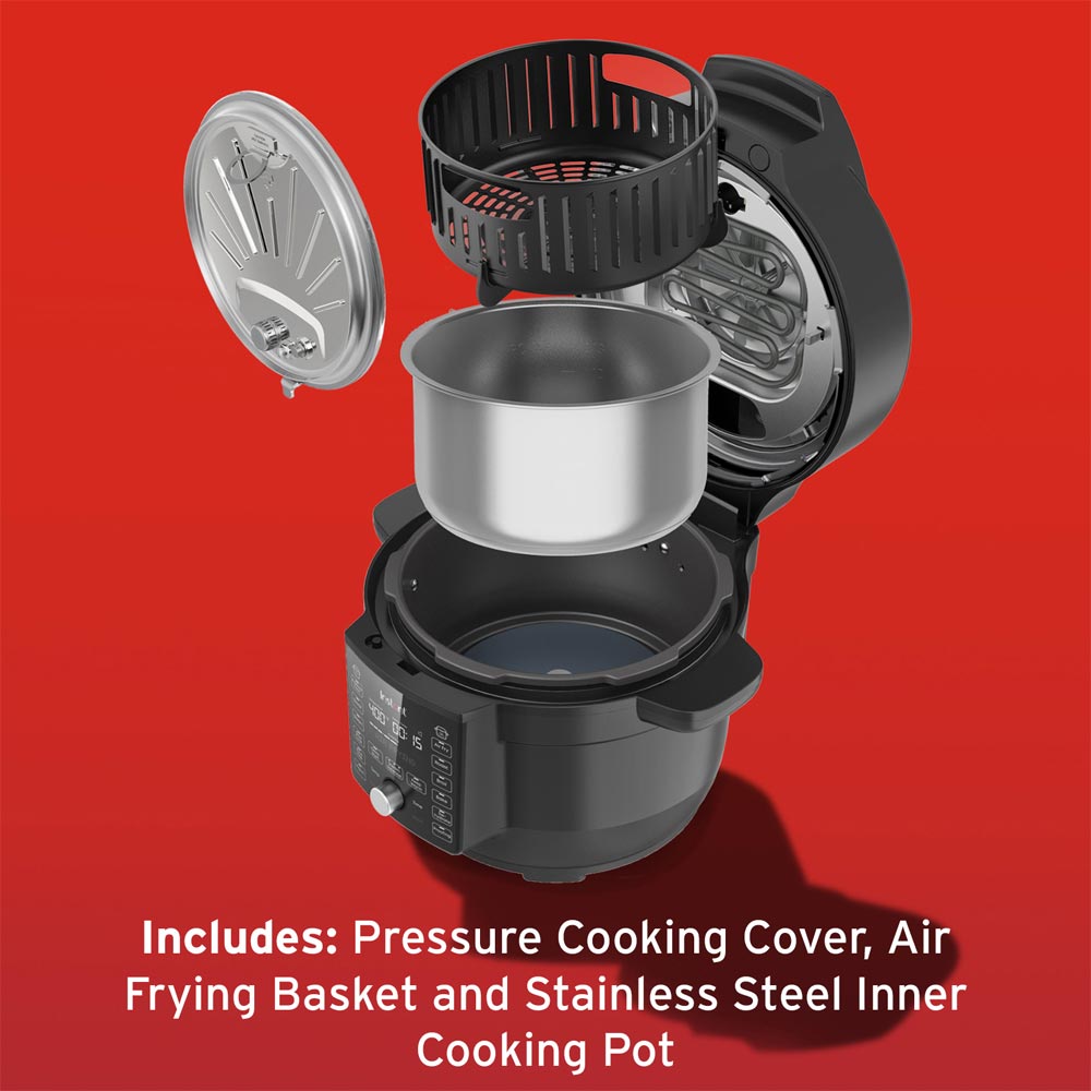 - Benefit from easy cleanup with dishwasher-safe components: stainless steel inner pot, air fryer basket, air fryer basket base, stainless steel steam rack, and pressure cooking cover (multi-cooker base and lid not dishwasher safe)