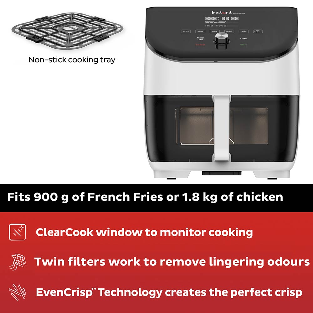The Instant Vortex Plus Air Fryer 5.7L White makes cooking a breeze. You’ll know exactly how your food is cooking by watching through the ClearCook window. Cook from fresh or frozen, this family sized air fryer can get dinner on the table 50% faster than an oven, and all at the touch of a button. Featuring 6-in-1 cooking, you can air fry, roast, grill, bake, reheat or dehydrate with ease. The spacious cooking drawer mean you can cook a 1.6kg whole chicken or 900g of chips while also using 95% less oil. Add the Instant Vortex Plus Air Fryer 5.7L White and clear the clutter from your counter.
