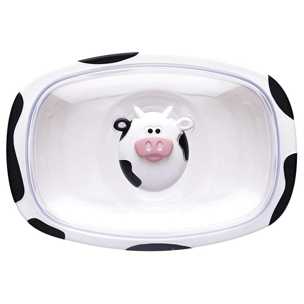 - Adorable black and white cow print on the bowl with cow character detail on the lid