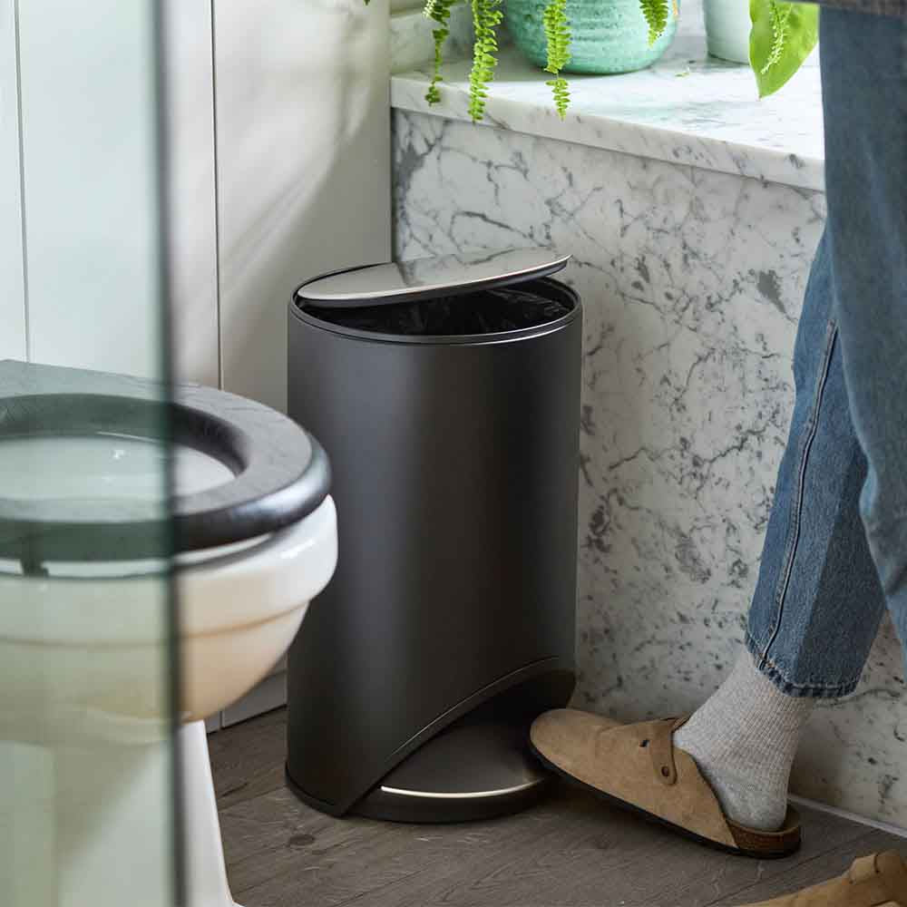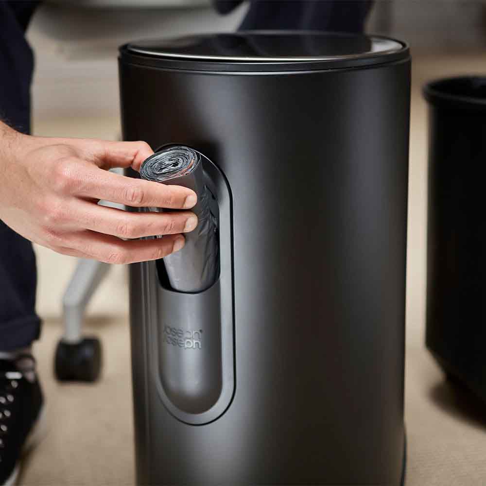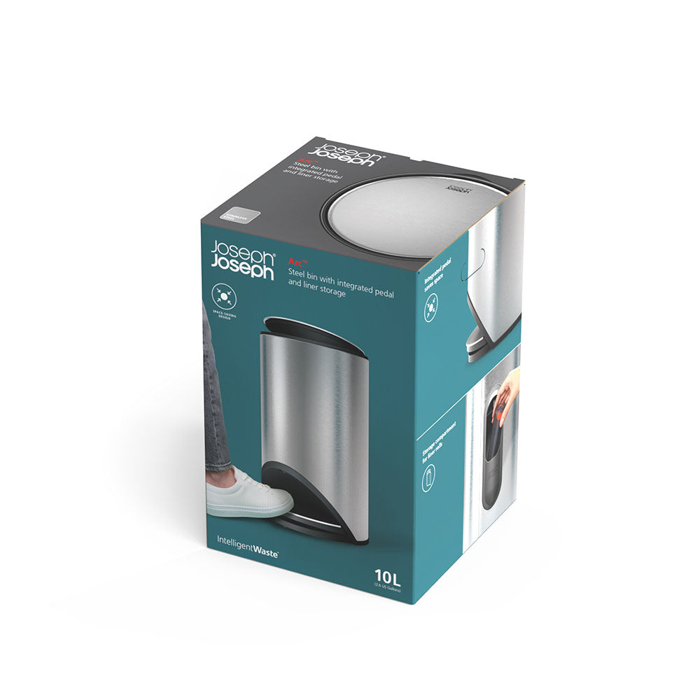 This streamlined, circular bin has a large pedal that fits neatly within the footprint of the bin, making it easy to open and saving valuable floor space. It also features a handy storage compartment for liner rolls, a soft-close lid with a fingerprint-proof coating and integrated odour control via a replaceable filter in the lid. Finished in stylish stainless steel, it has an easy-empty removable bucket and is compatible with Joseph Joseph IW5 custom-fit liners.
