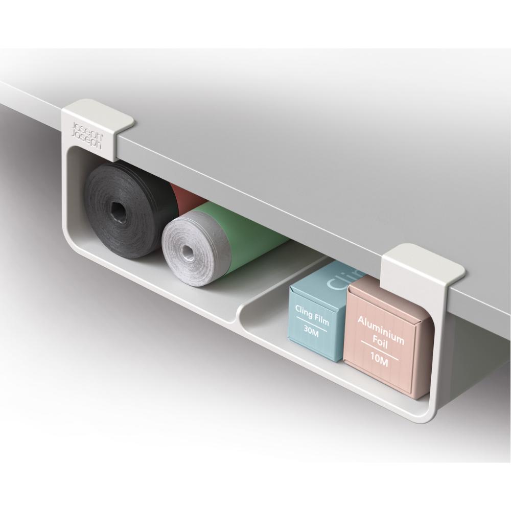 Utilise unused cupboard space with this large film, foil, and bag organiser, designed to attach securely beneath shelves. Ideal for holding larger rolls and boxes, it helps declutter your kitchen and keeps essentials within easy reach. The organiser is simple to install, offering a tool-free setup using strong 3M™ VHB™ tape, with the option to secure it with screws if preferred. It's also made with a minimum of 50% post-consumer recycled plastic.