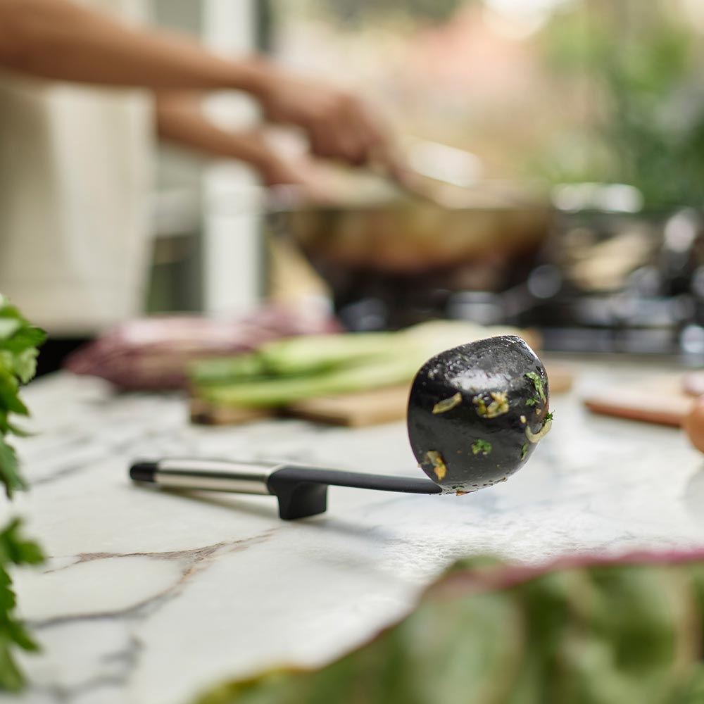 The Joseph Joseph Elevate Fusion 5 Piece Silicone Utensil Set with Stand is where style meets functionality in the heart of your kitchen. This chic set boasts heat-resistant silicone heads and polished stainless-steel handles for a perfect fusion of durability and elegance. The integrated tool rests ensure a pristine cooking space, preventing utensil heads from making contact with surfaces. Heat-resistant up to 210ºC/410ºF, with tongs reaching an impressive 270ºC/520ºF, these tools are tailor-made for non-stick cookware. The compact stand minimises countertop clutter, providing convenient access to a solid turner, ladle, skimmer spoon, precision tongs and large tongs. Elevate your culinary experience with the essential Joseph Joseph Elevate Fusion 5 Piece Silicone Utensil Set with Stand.