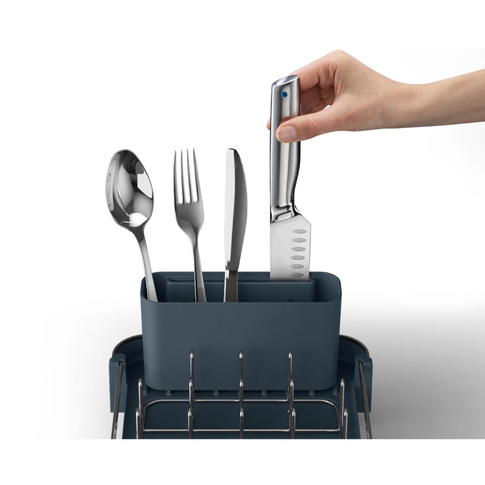 This clever, compact dish rack is ideal for smaller kitchens, offering an efficient space-saving solution. It features a two-part sliding tray that extends for extra drying space, as well as steel prongs that securely hold your dishes. Ribs on the base prevent water becoming trapped under cups and glasses, and it features a spout that can be positioned in three different ways to drain directly into your sink. The rack also includes a removable cutlery pot for easy cleaning with a dedicated knife slot for safer drying of sharp blades.