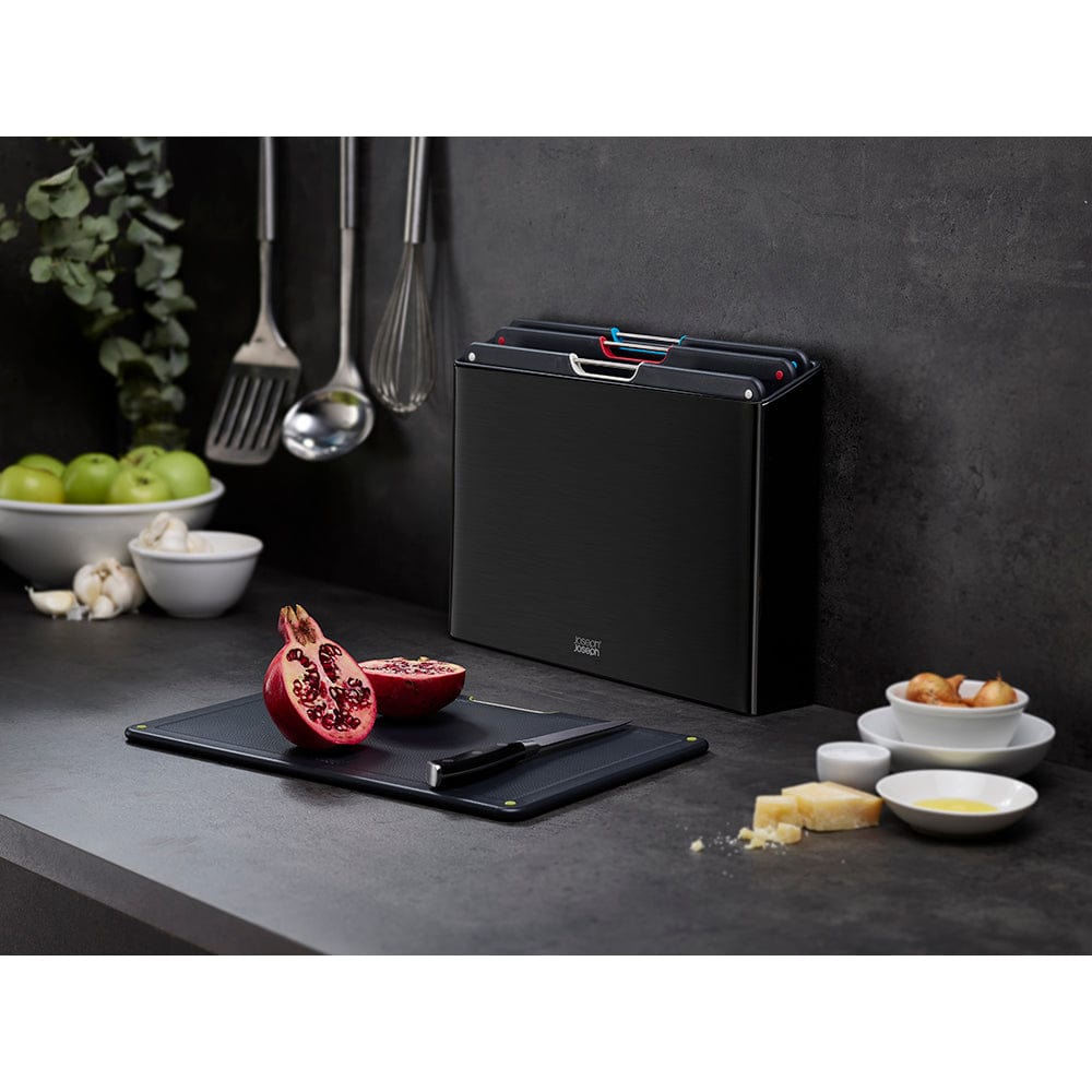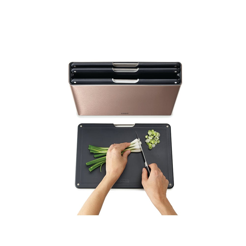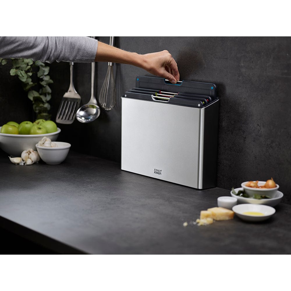 Prepare your meals in style with the beautifully designed Joseph Joseph Folio Steel 4 Piece Choping Board Set