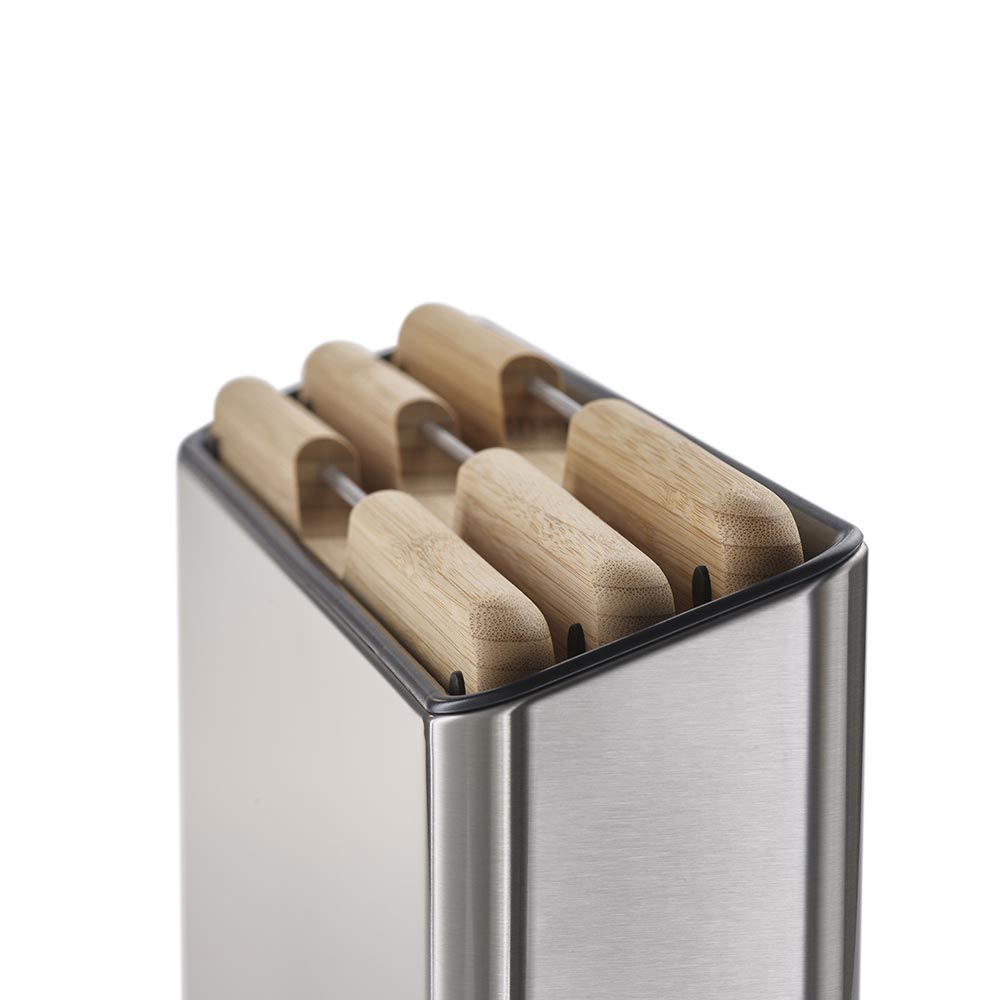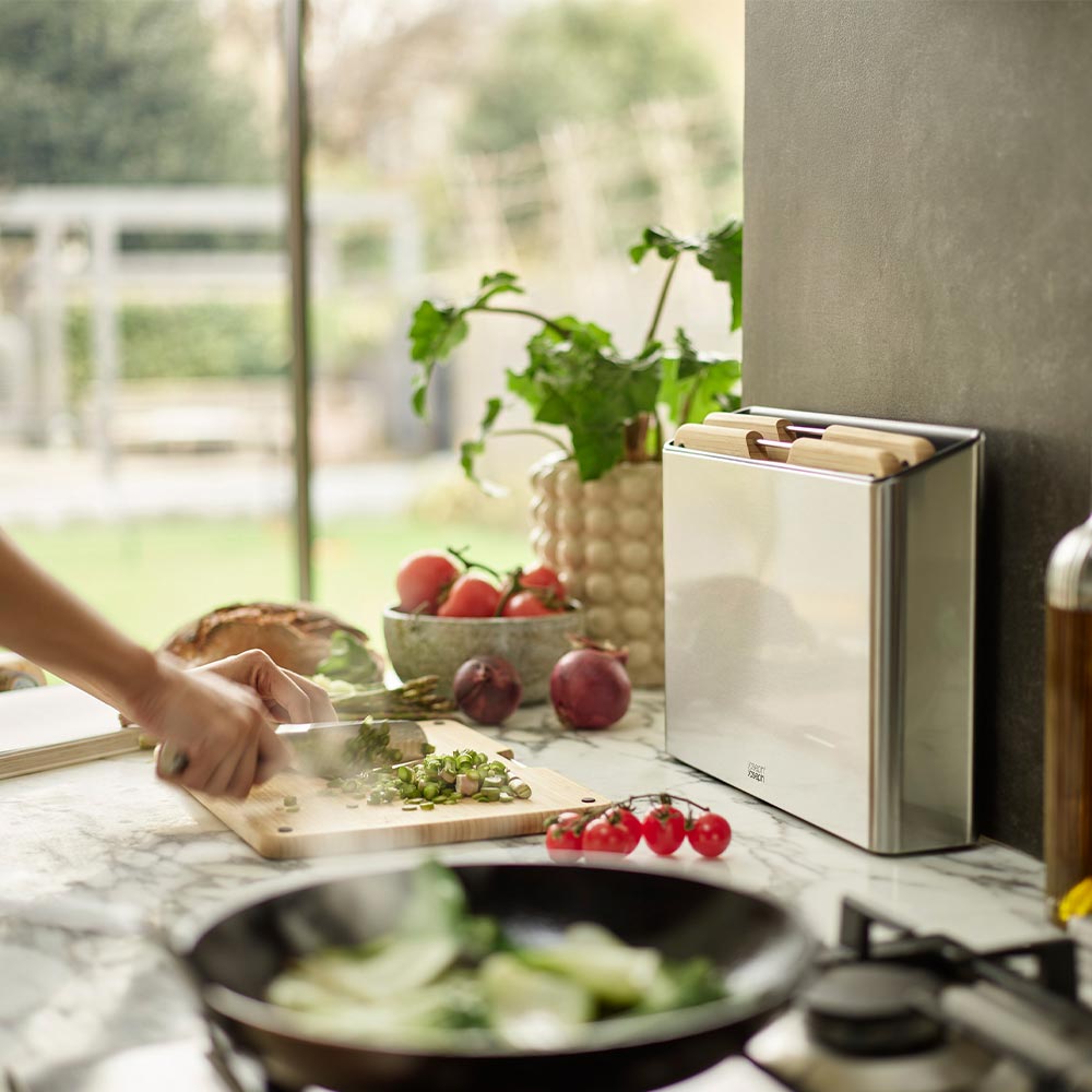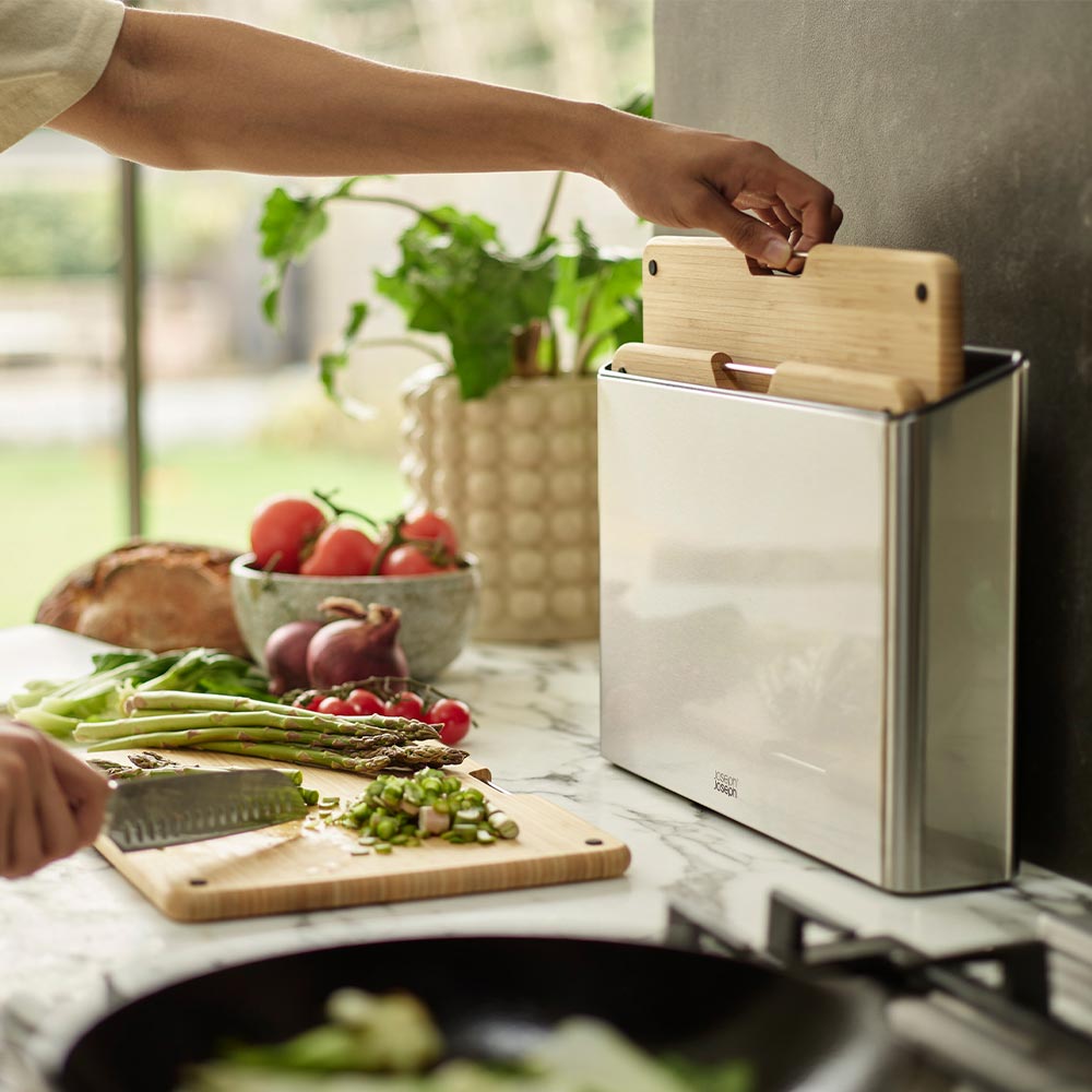 Elevate your culinary experience with the Joseph Joseph Folio Steel Bamboo 3 Piece Chopping Board Set with Storage Case. Immerse yourself in the seamless blend of functionality and elegance as the slimline stainless steel case organises three double-sided bamboo chopping boards. With non-slip feet, these boards offer a secure cutting surface for lasting durability. The stainless-steel bars facilitate easy board selection, ensuring a hassle-free cooking process. Embrace the sleek, fingerprint-proof stainless-steel case that not only adds a touch of sophistication to your kitchen but also holds the boards apart, promoting air circulation. Make a bold statement on your worktop with this stunning and practical Joseph Joseph Folio Steel Bamboo 3 Piece Chopping Board Set with Storage Case.