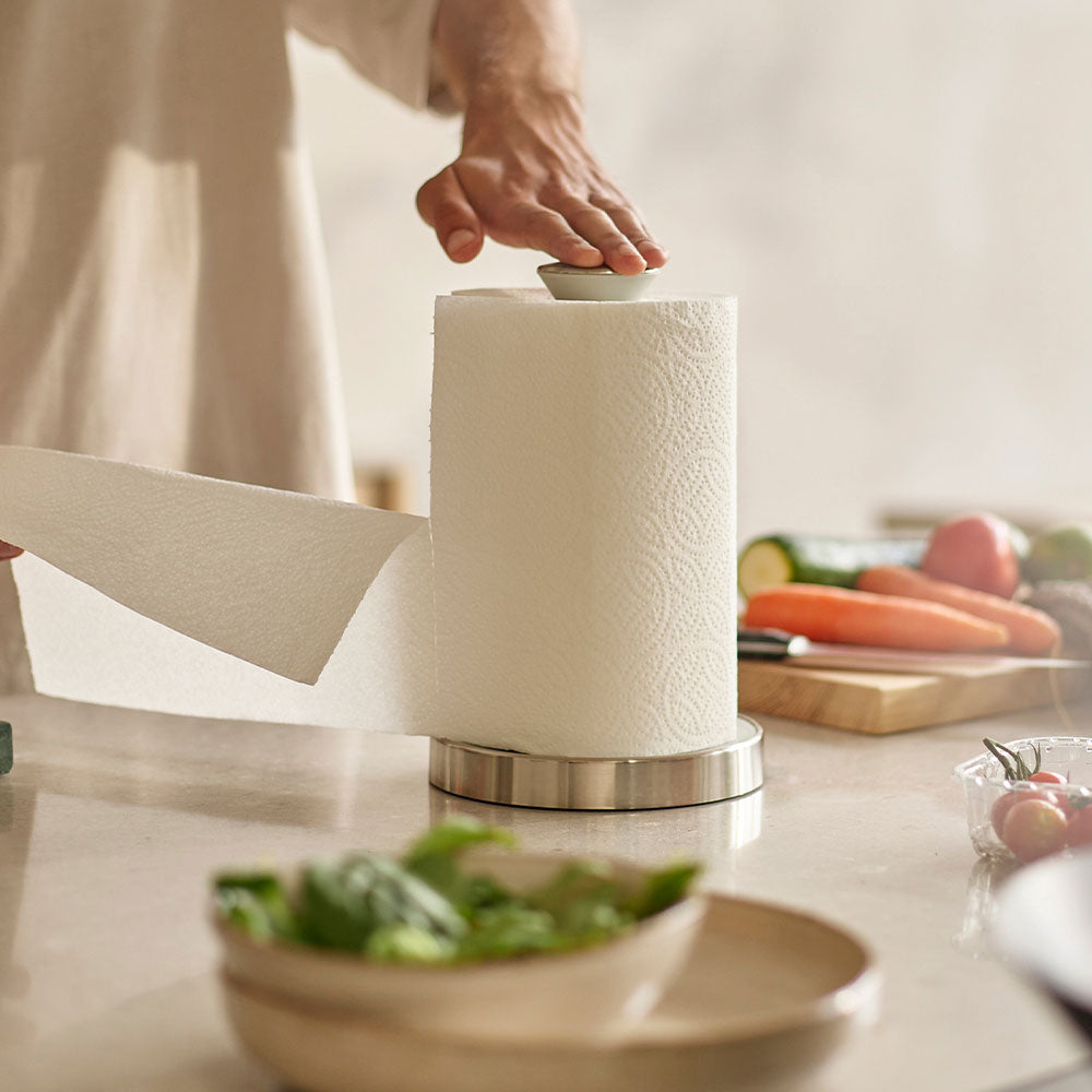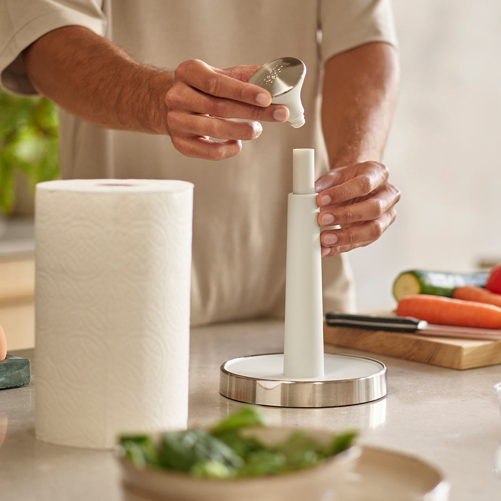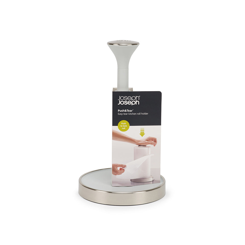 The smart Joseph Joseph Push&Tear™ Easy-Tear Kitchen Roll Holder features a sprung top cap that can be pushed down to lock the roll for easy tearing. A raised edge on the base prevents the remaining roll from unravelling and a non-slip base keeps the unit securely in place during use. To replace the roll, simply twist off the top cap. Suitable for standard roll heights only - up to 24 cm. Complete the kitchen set up with the coordinating Joseph Joseph collection.